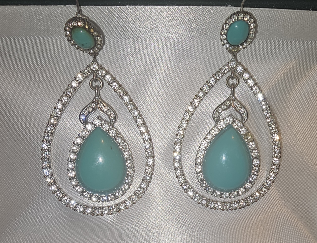 These are a lovely pair of teardrop earrings featuring turquoise stones and a surround of clear stones. They're in great condition and would add a touch of elegance to any outfit