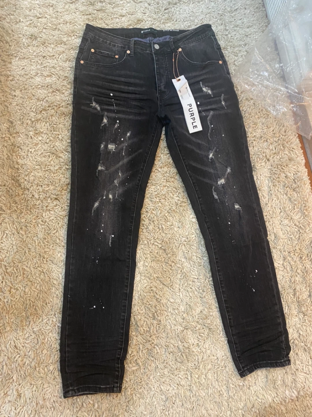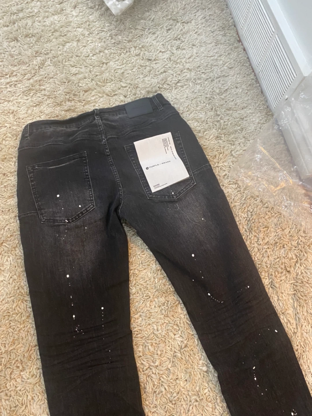 Purple Brand jeans in a black wash with distressed detailing and white paint splatters. These are a size 34.
