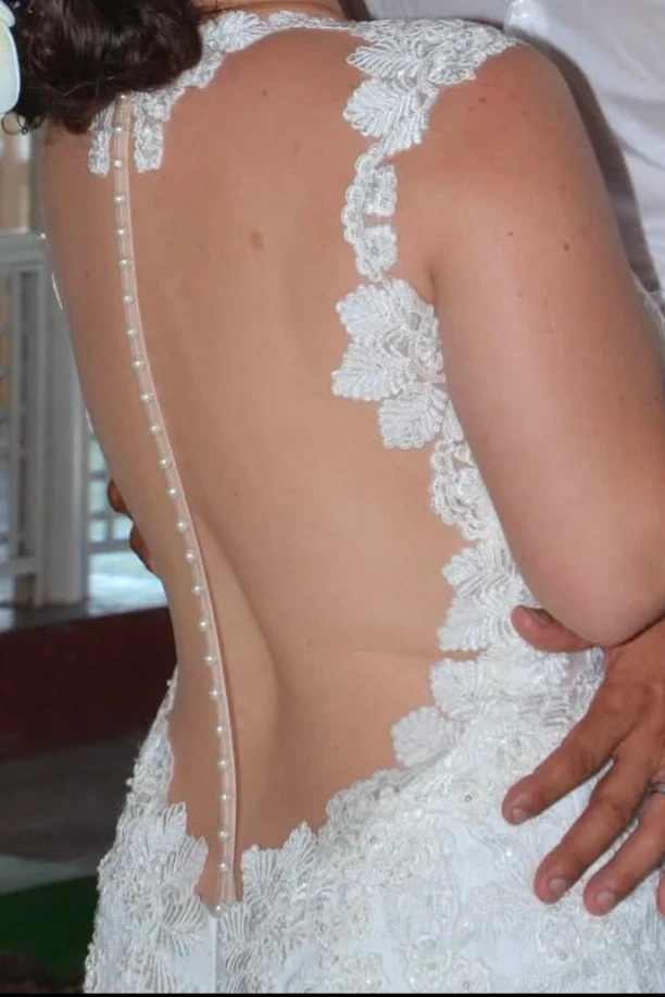 Beautiful white dress with intricate lace and beadwork. Features a stunning illusion back with a pearl closure. The dress has a fitted silhouette with a dramatic train. Stored in original preservation box. The designer is Ines Di Santo, 2019.