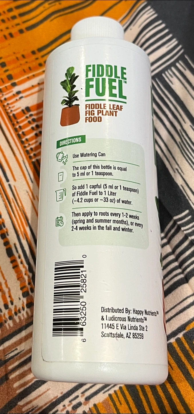 8 fl oz (250 mL) bottle of Fiddle Leaf Fig plant food. Instructions included. Happy Nutrients distributor.