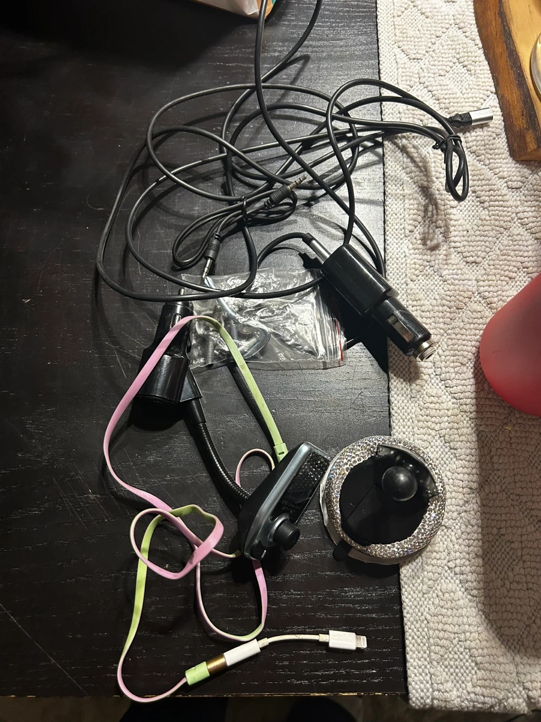 Bundle of car accessories including a cigarette lighter charger, a mount with a sparkling trim, and various charging cables. It's a collection of car tech essentials. #freecycle