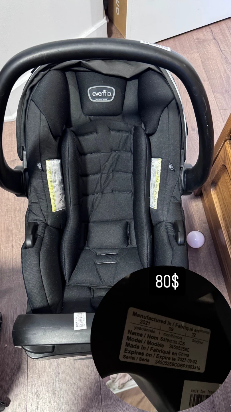 This Evenflo Safemax ICS infant car seat was manufactured in 2021. It expires on September 2, 2027. Made in China.