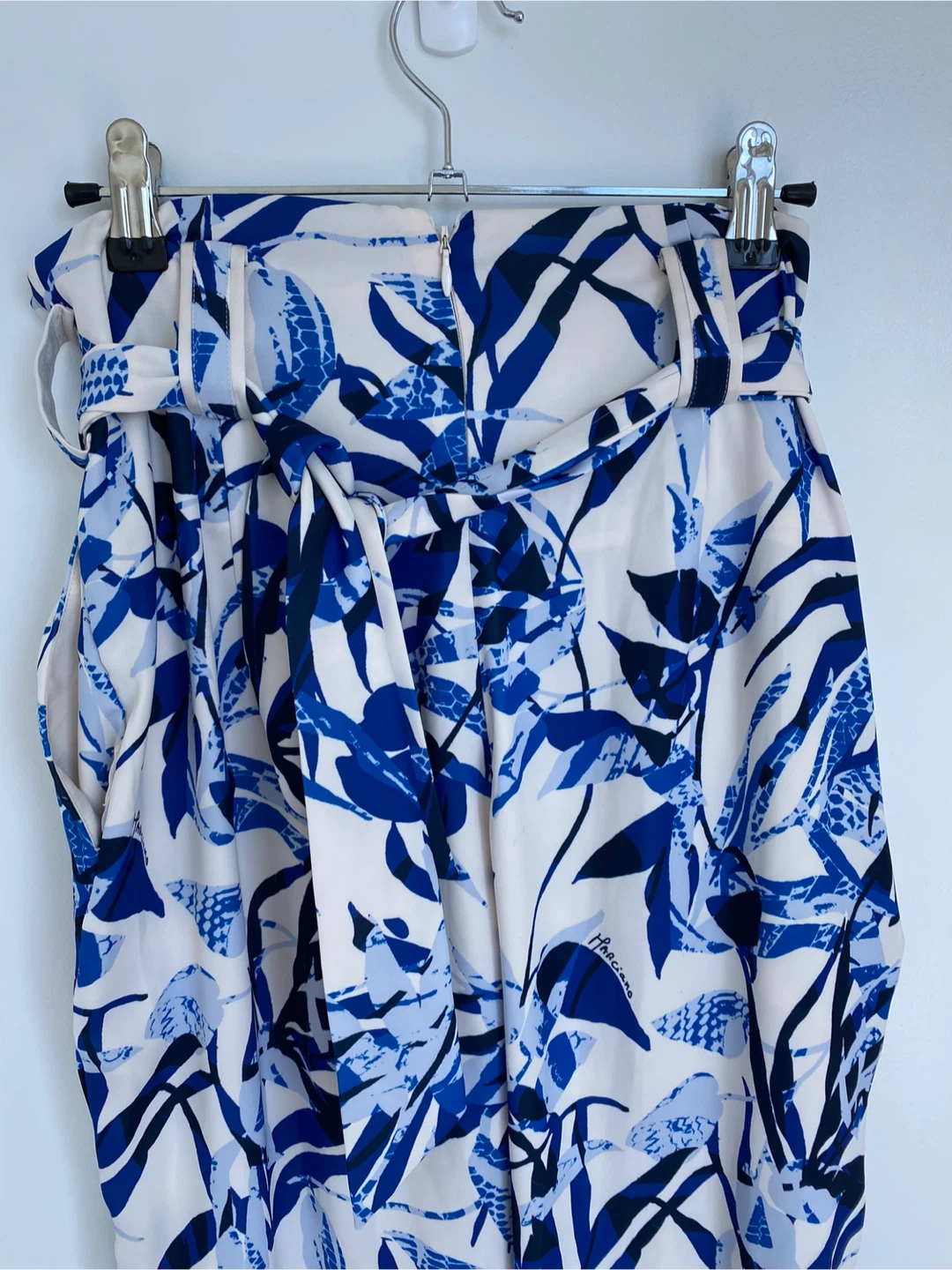 These stylish wide leg pants feature a blue and white leaf print. They have a high-waisted fit with a tie belt. Made from a lightweight fabric, they're perfect for warmer weather.