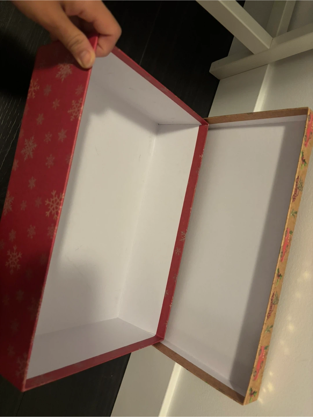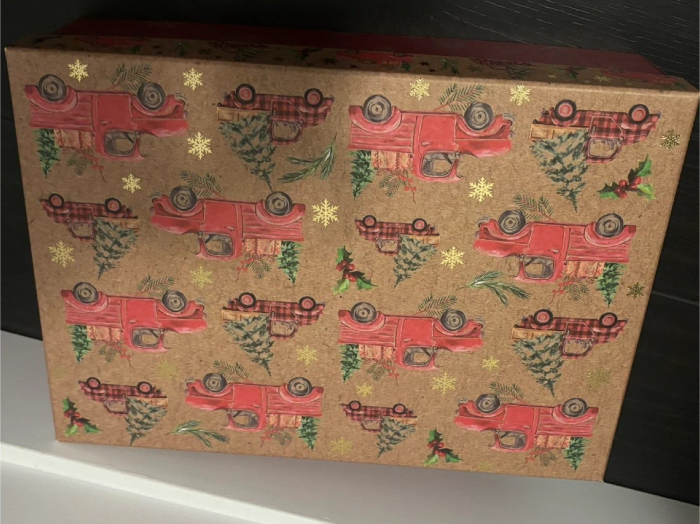 This festive gift box features a charming red truck design with evergreen trees and snowflakes. It's perfect for packaging holiday presents. Cardboard construction.