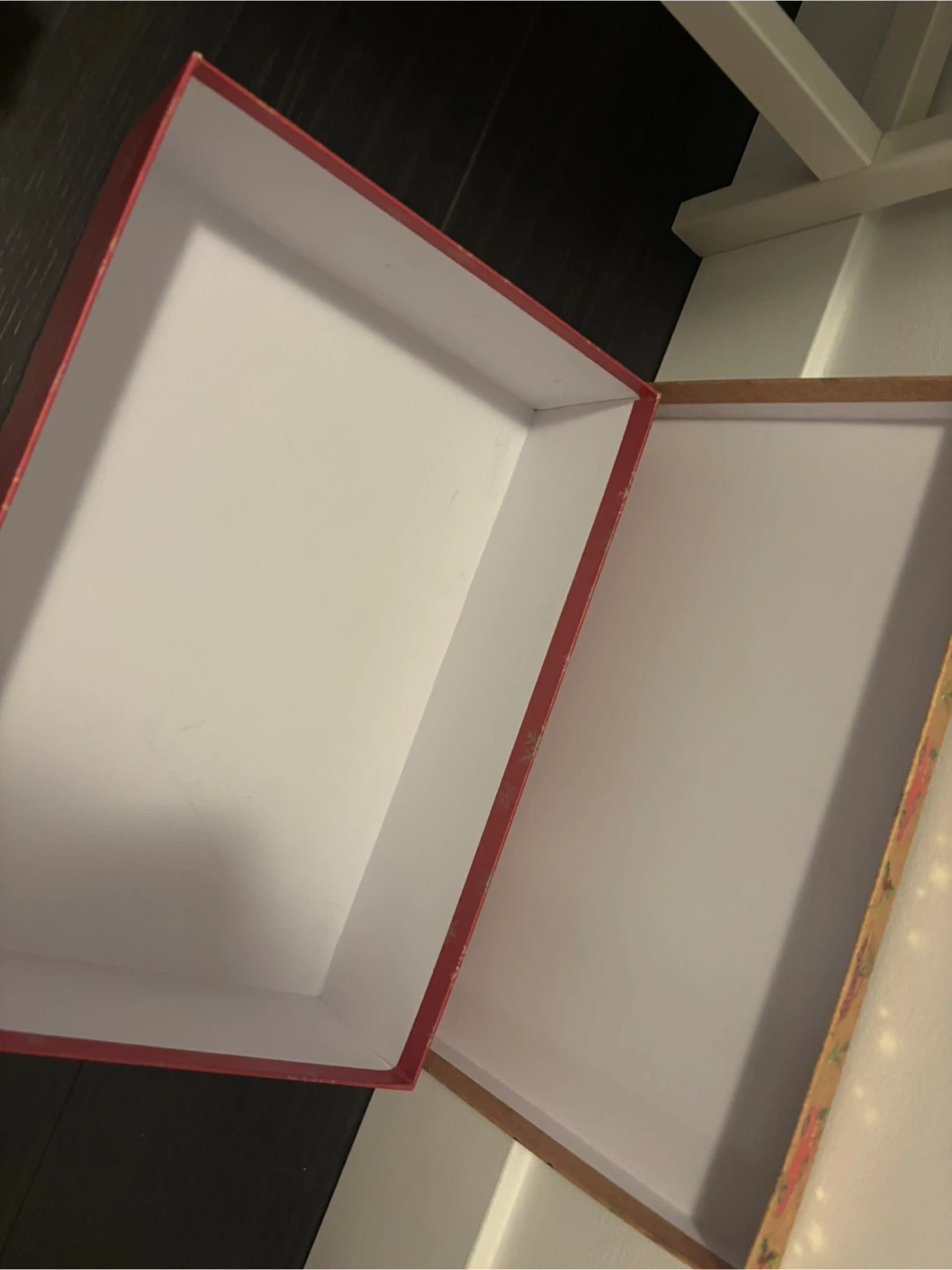 This festive gift box features a charming red truck design with evergreen trees and snowflakes. It's perfect for packaging holiday presents. Cardboard construction.