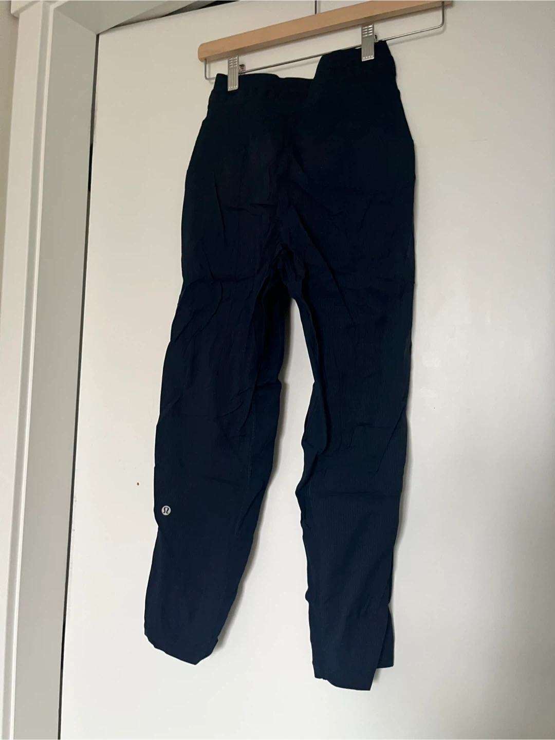 Navy blue Lululemon dance studio pants. These pants are made from a comfortable fabric and feature a drawstring waist. They're great for workouts or casual wear!
