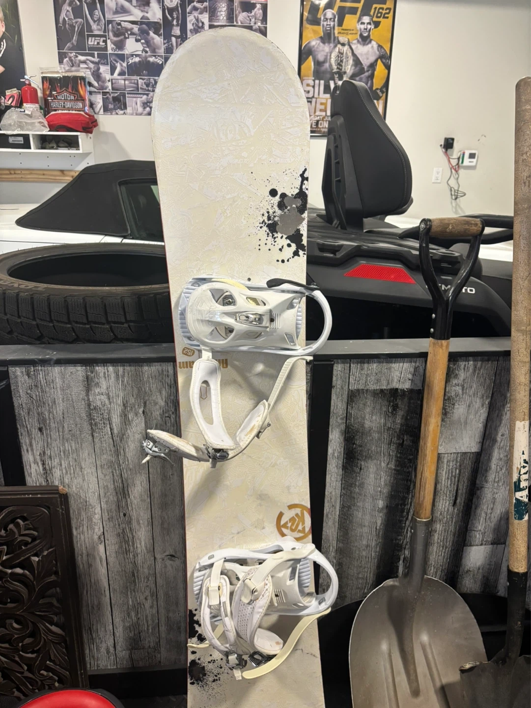 This is a used snowboard with bindings. It features a white and red design on one side and a cream-coloured pattern with black splatter on the other. The bindings are white and adjustable. 53 in 52-54