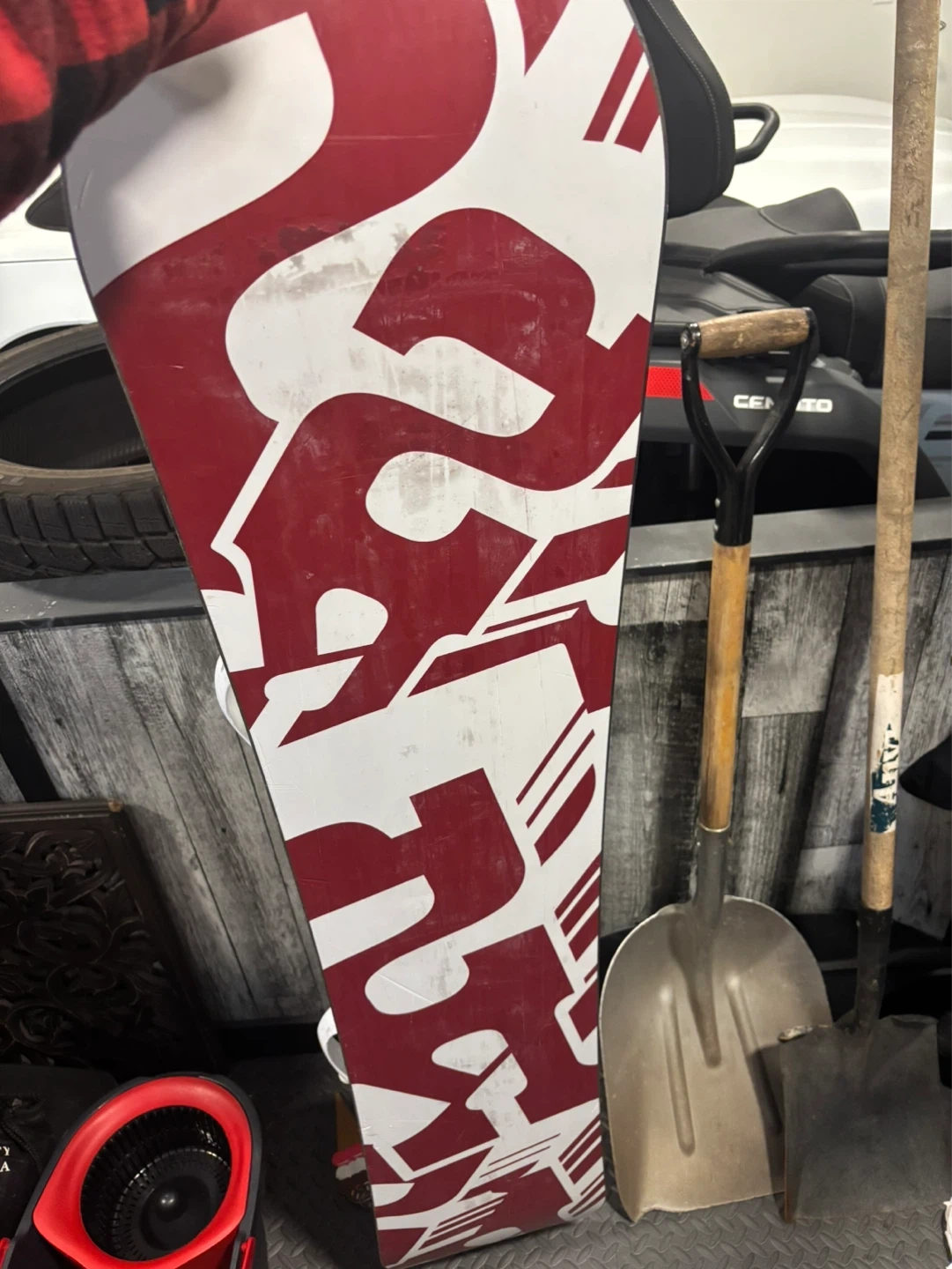 This is a used snowboard with bindings. It features a white and red design on one side and a cream-coloured pattern with black splatter on the other. The bindings are white and adjustable. 53 in 52-54