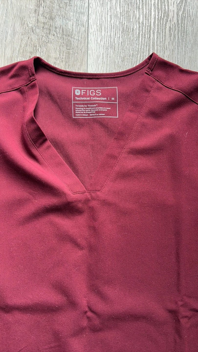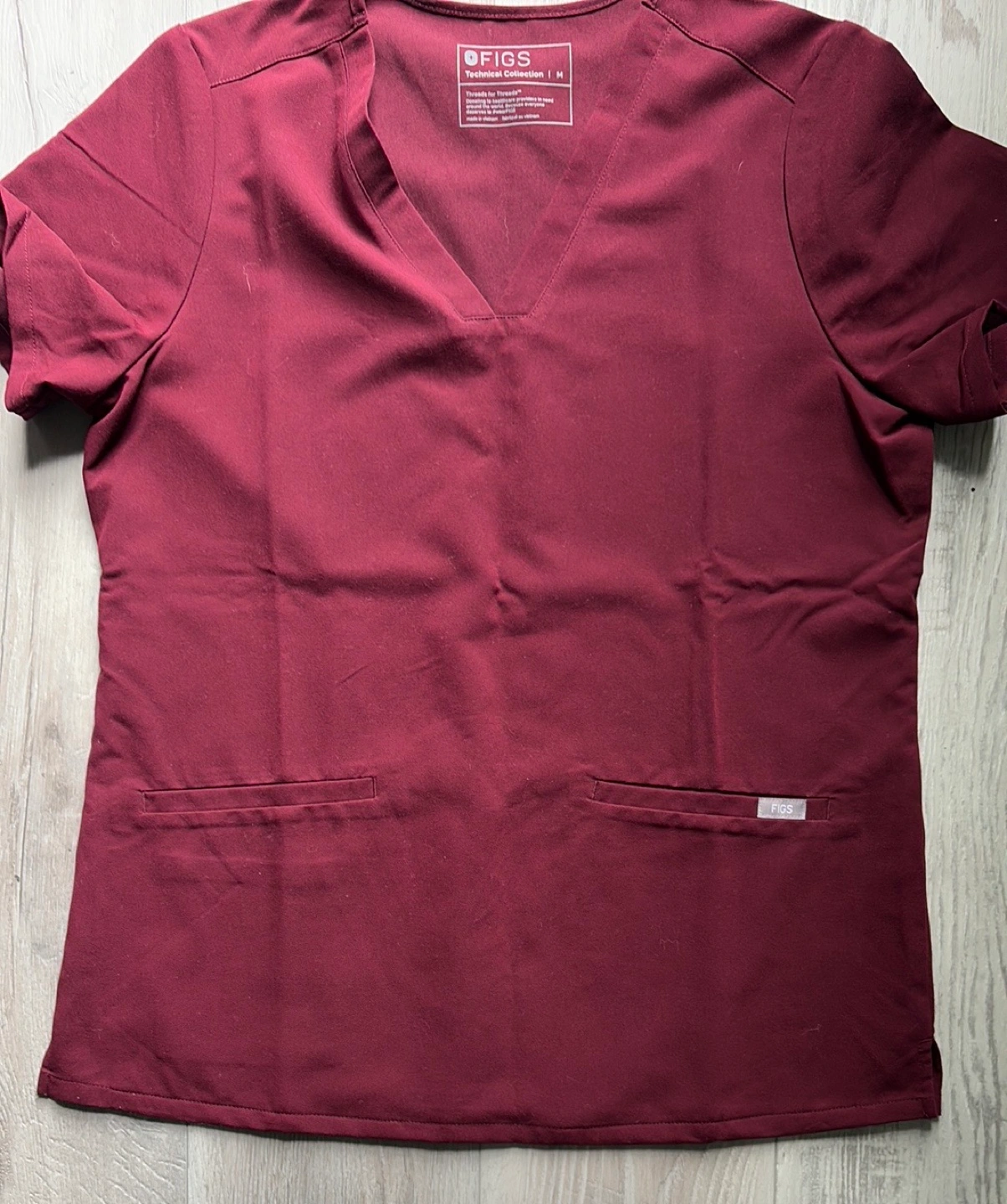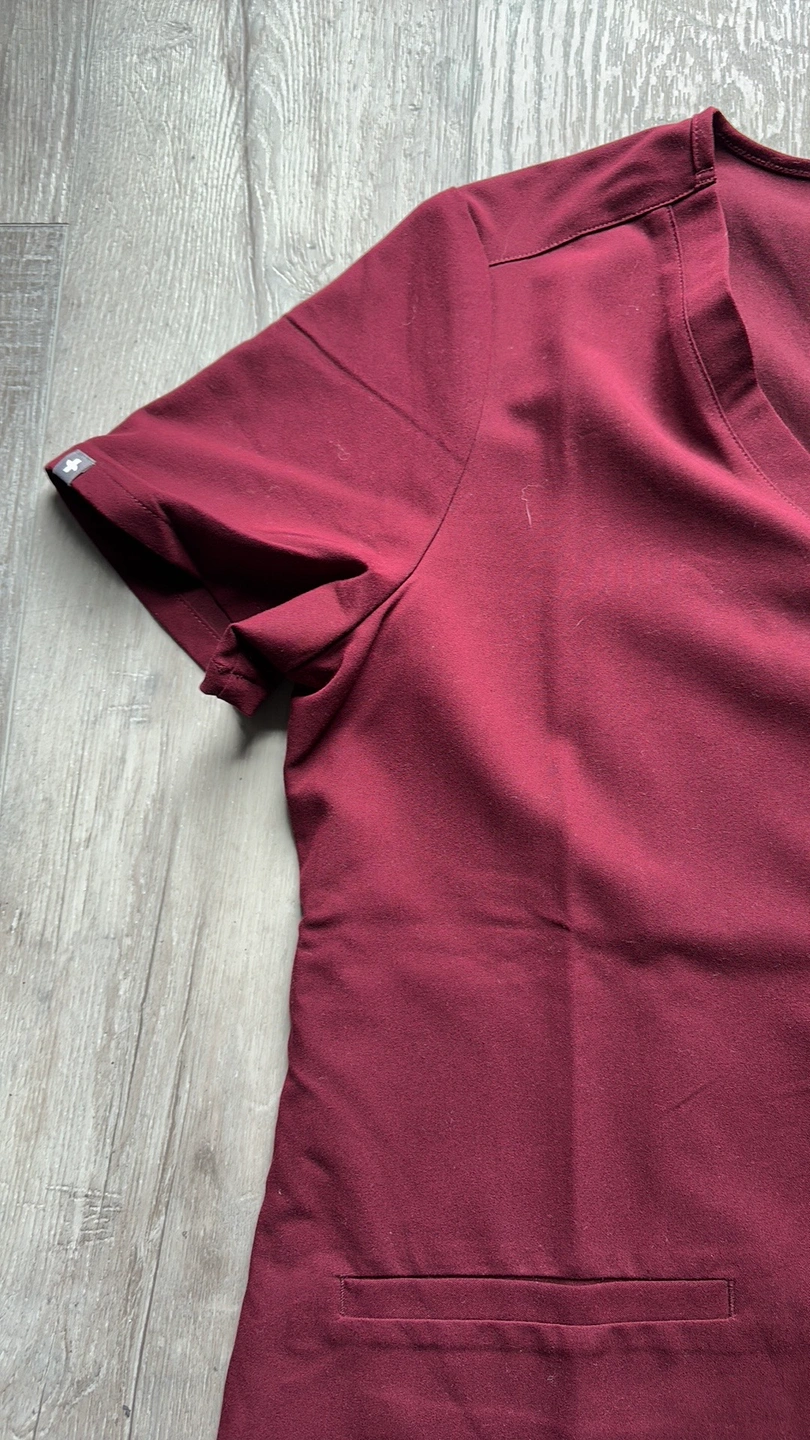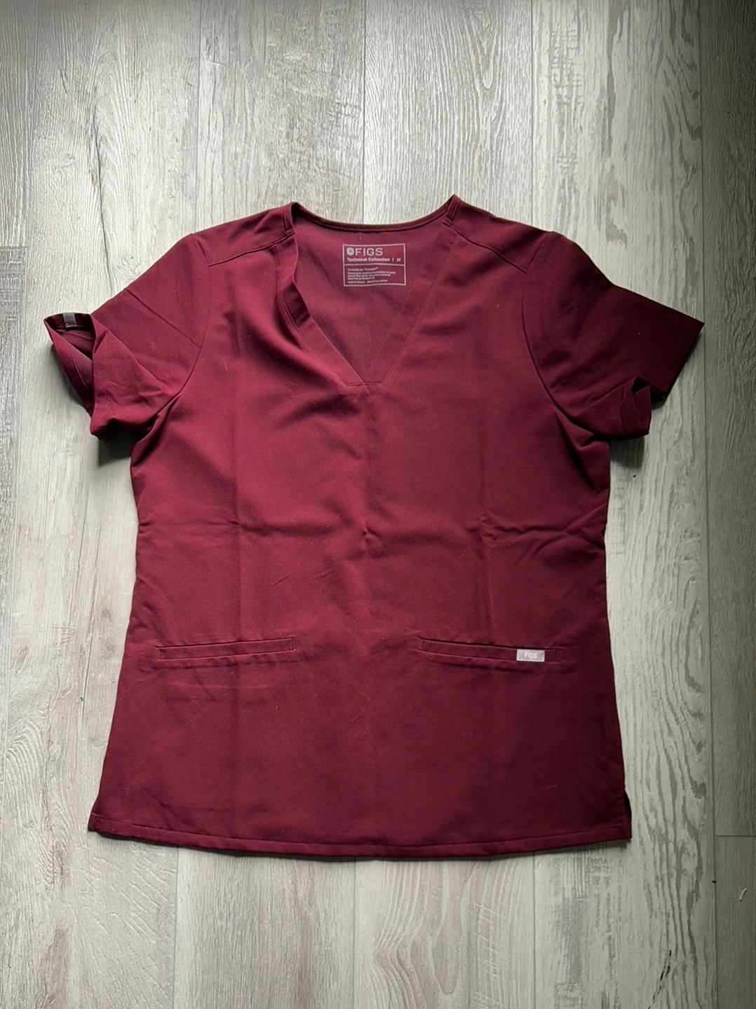 Figs 3 pocket scrub top, burgundy in color. Only worn maybe 3 times max No signs of wear, discolouration or stains