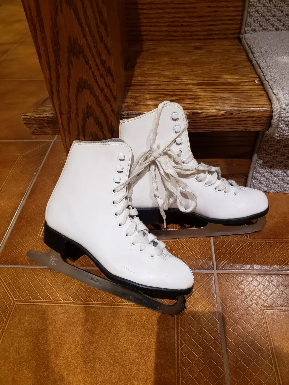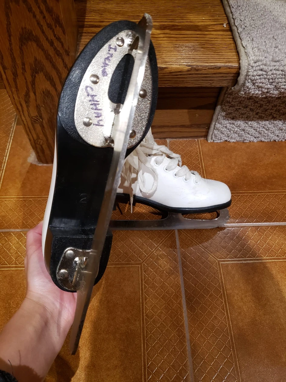 955Figure Ice Skates Size 2 (8 inches from heel to toe) for sale. Used in Good condition. Obvious wear. And someone's name is written on the bottom (see photo). Pick-up in North York (Yonge & Cummer). PM for details.