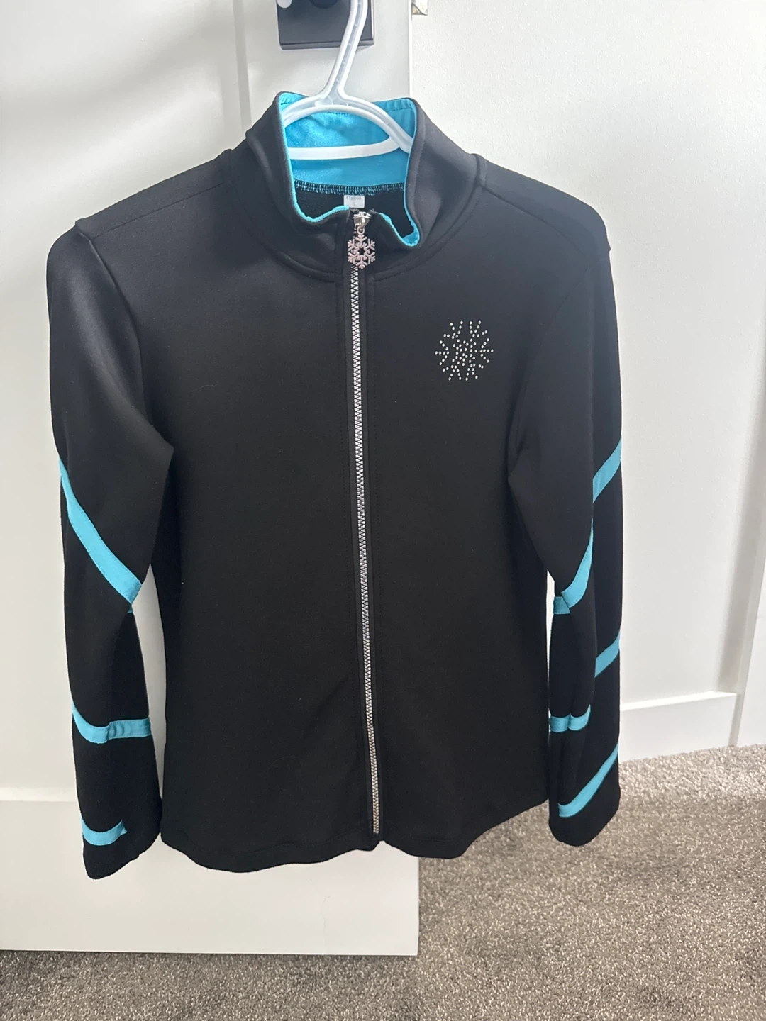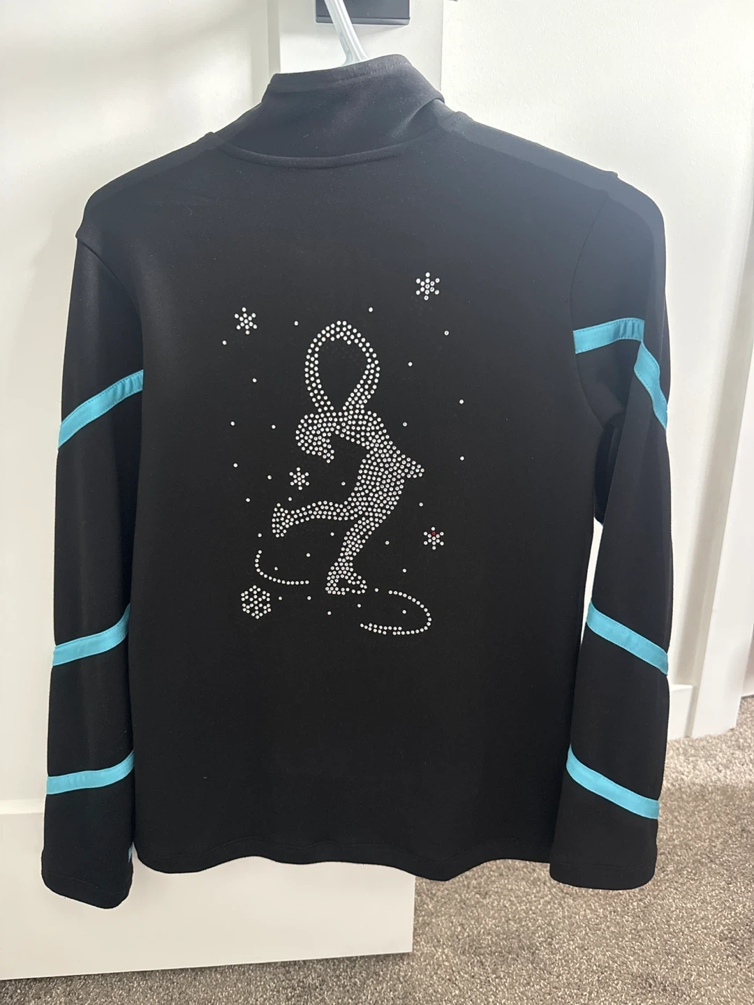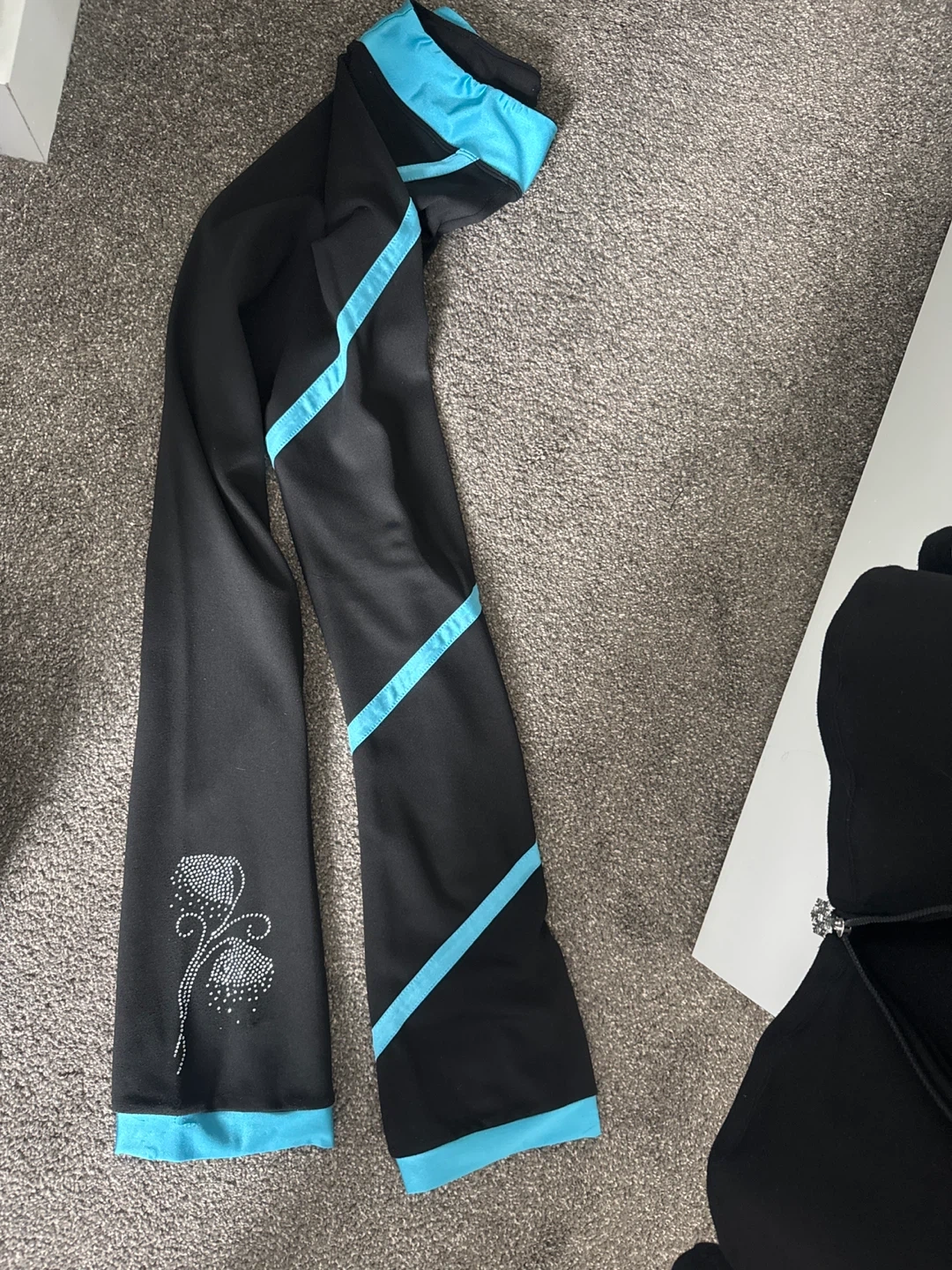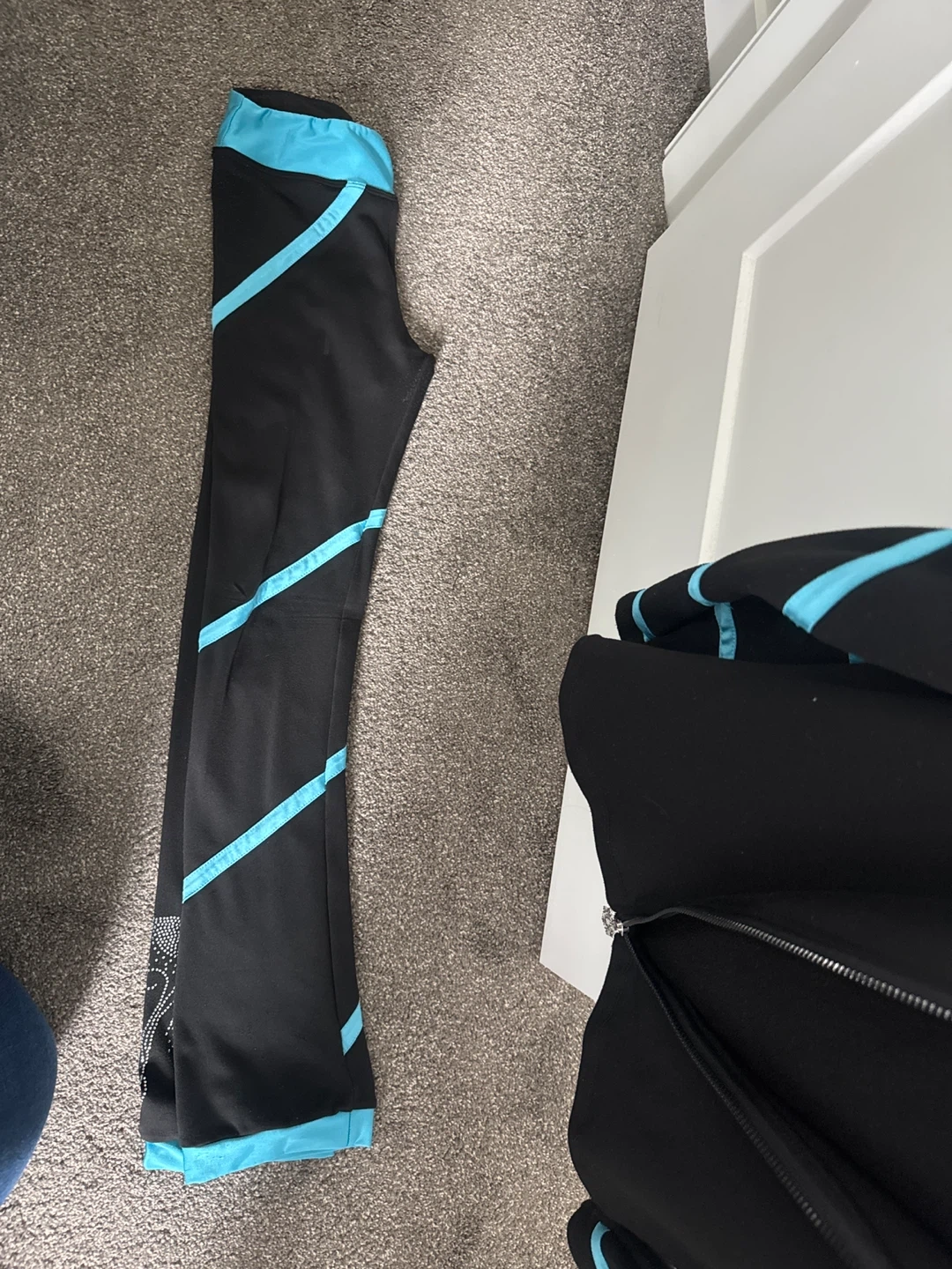 Selling a figure skating outfit that includes a jacket and pants. The outfit is black with light blue accents and has rhinestone detailing. Perfect for practice or performance! Size S
