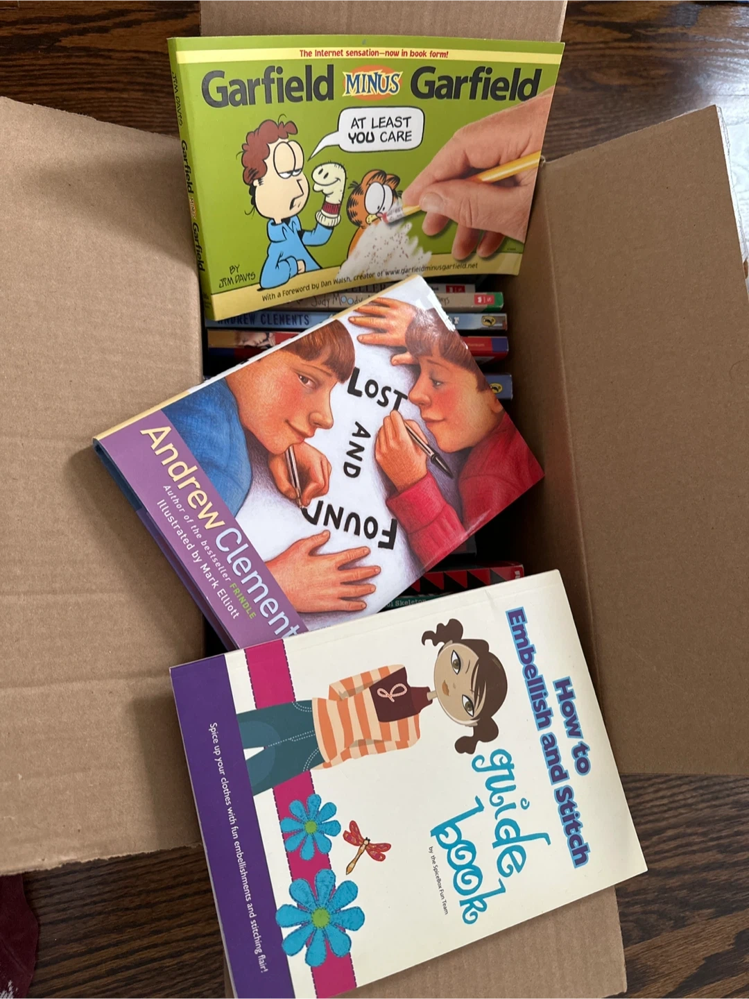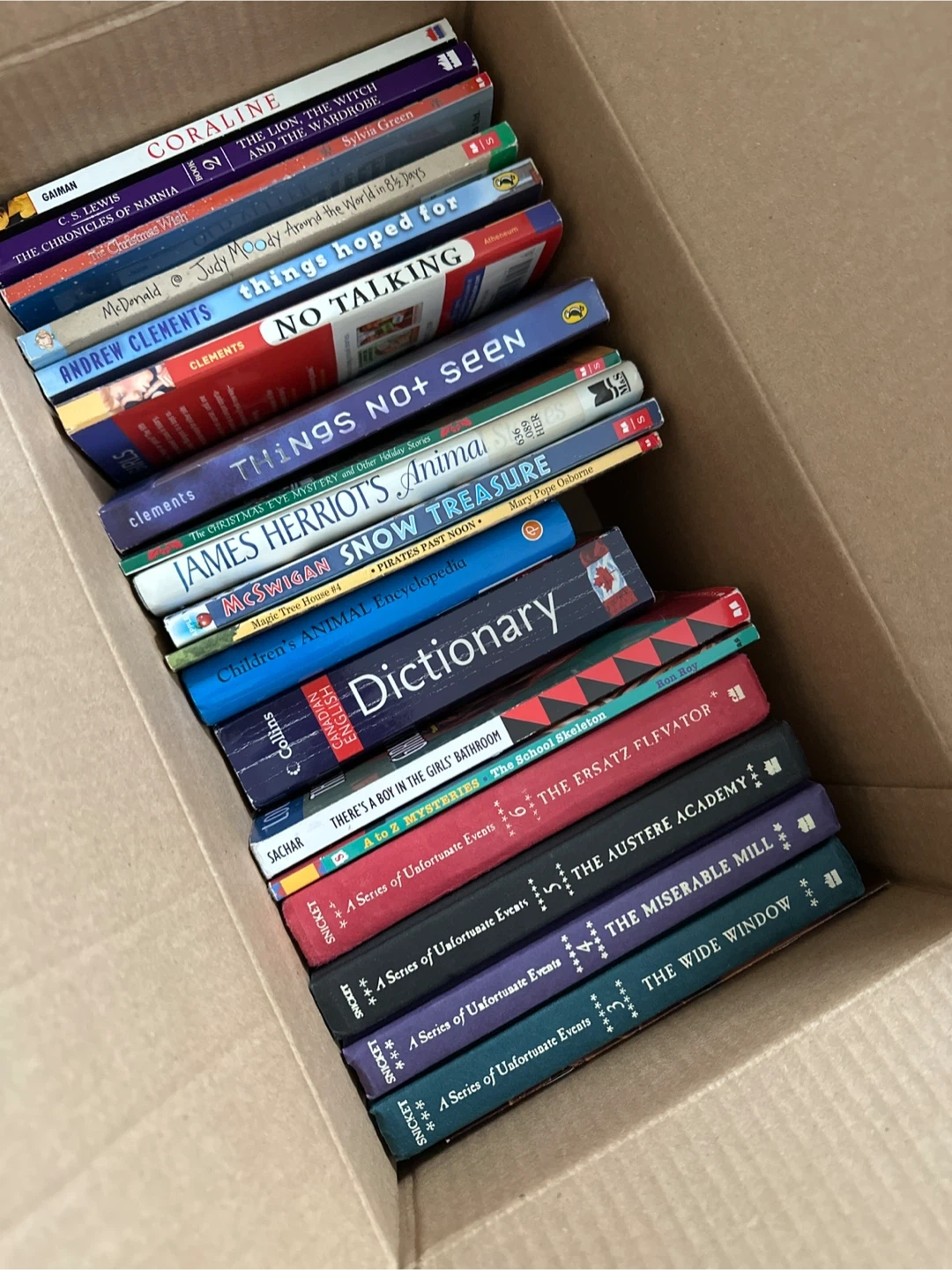 This is a collection of various children's books. Titles like Series of Unfortunate Events, Andrew Clement’s, Joody Moody, Coraline, Chronicles of Narnia.