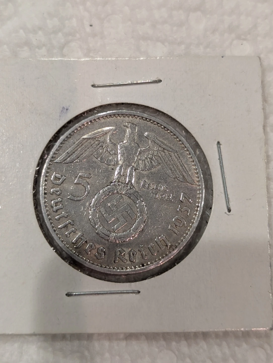 1937- A 5 Reichsmark authentic WW 2 , composition: silver; fineness 0.900 (90% silver) , weight 13.88 grams ASW ; 0.4016 oz . This coin is in excellent condition.