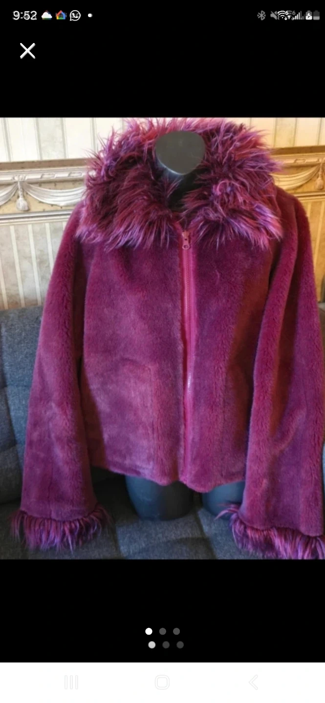 Here's a stylish faux fur coat in a lovely shade of burgundy. It's perfect for adding a touch of warmth and flair to your outfit. The faux fur trim adds a fun and fashionable detail