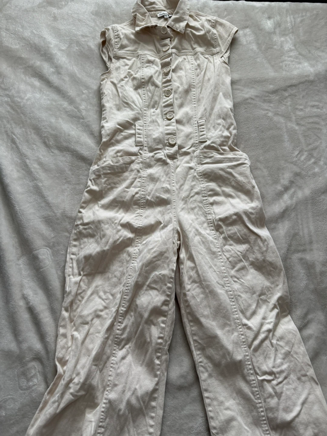 This is a cream coloured, sleeveless jumpsuit from Hunter & Boo. It has a collared neckline and button-up front. Size is small. Made in China.