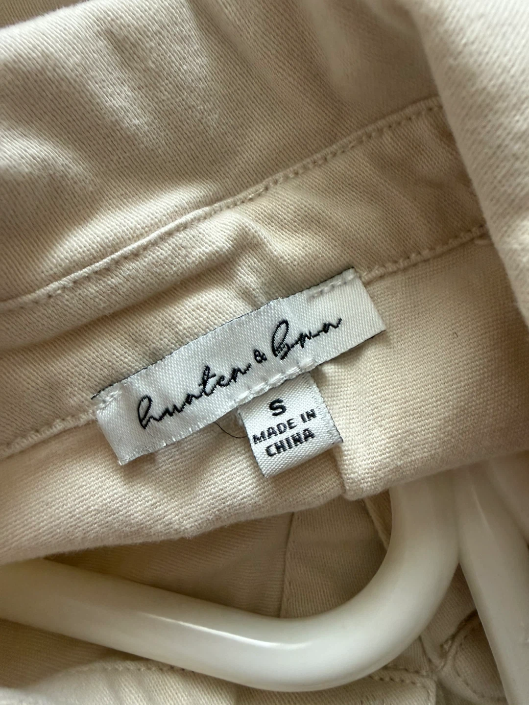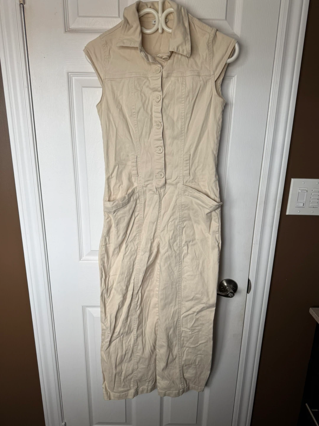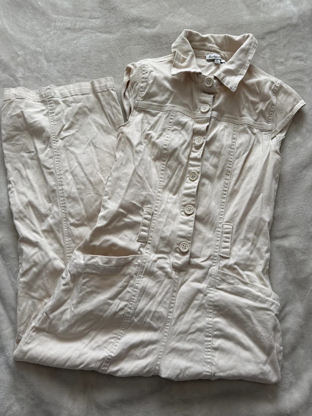 This is a cream coloured, sleeveless jumpsuit from Hunter & Boo. It has a collared neckline and button-up front. Size is small. Made in China.