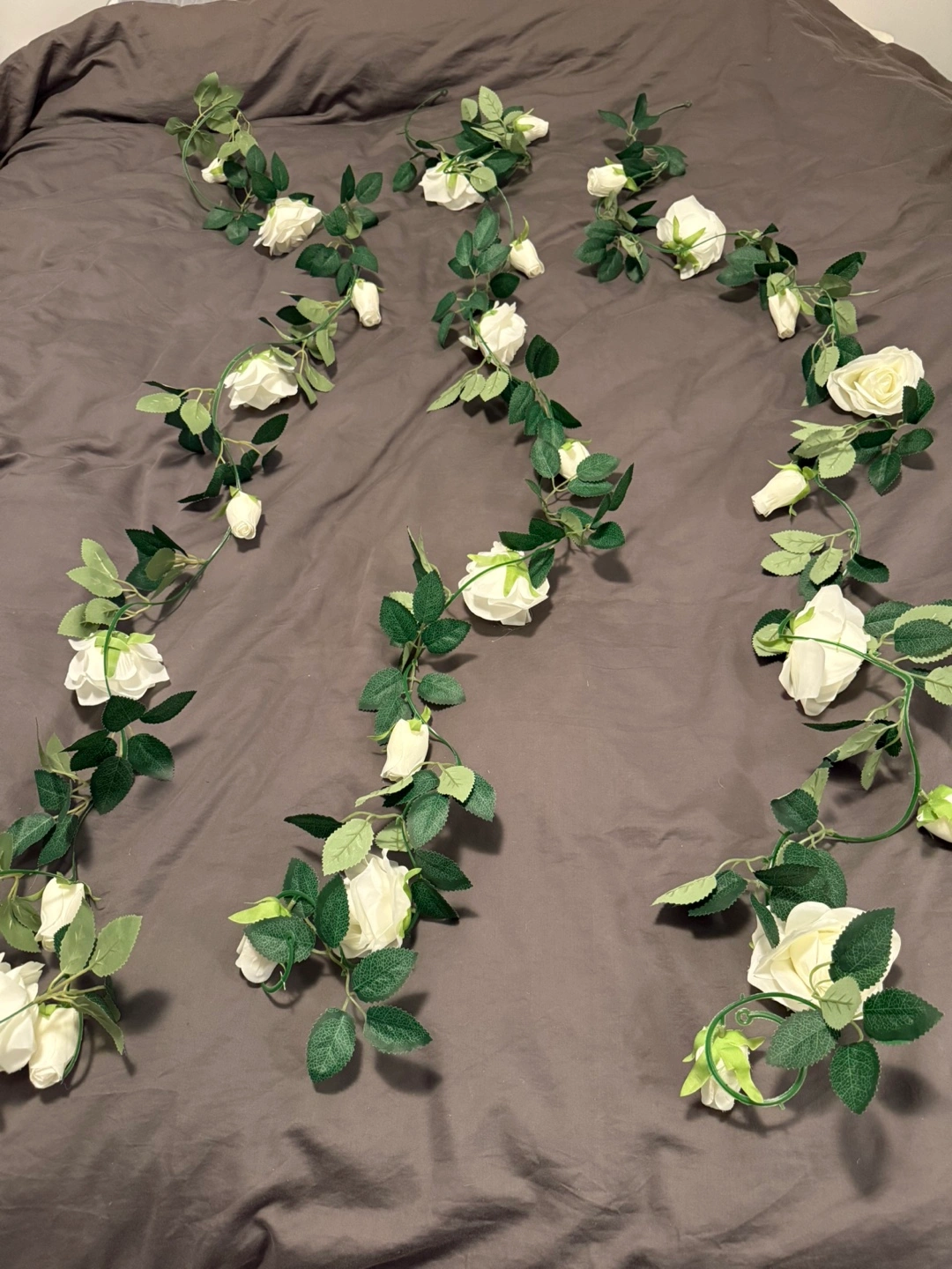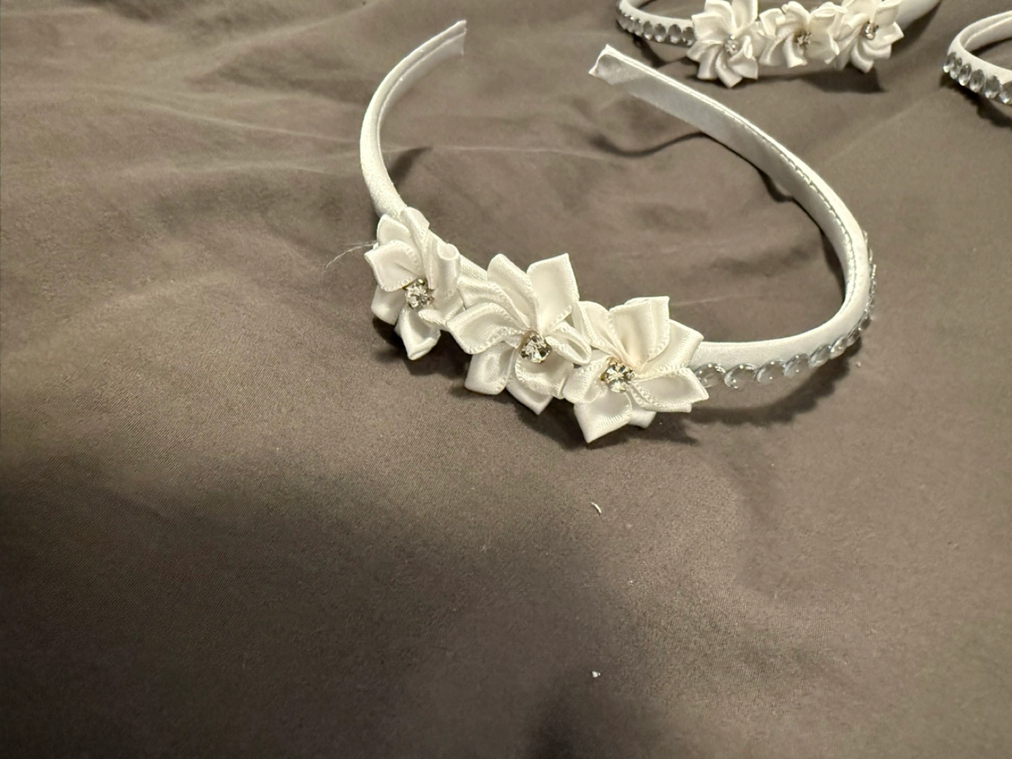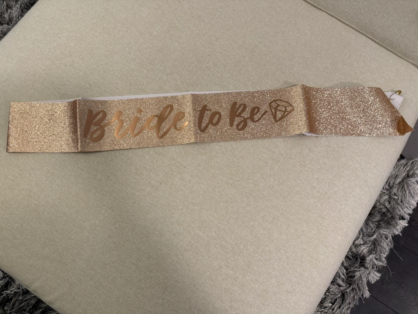 Beautiful wedding/ bachelorette accessories. Includes new, never worn three flower girl headbands, one ring pillow, an engagement picture frame, bride to be sash, bachelorette tiara, flower garlands for staircase banisters or wall or table decor, bride to be cake sign and 50 artificial petals in burgundy. Perfect for an elegant wedding or engagement parties.