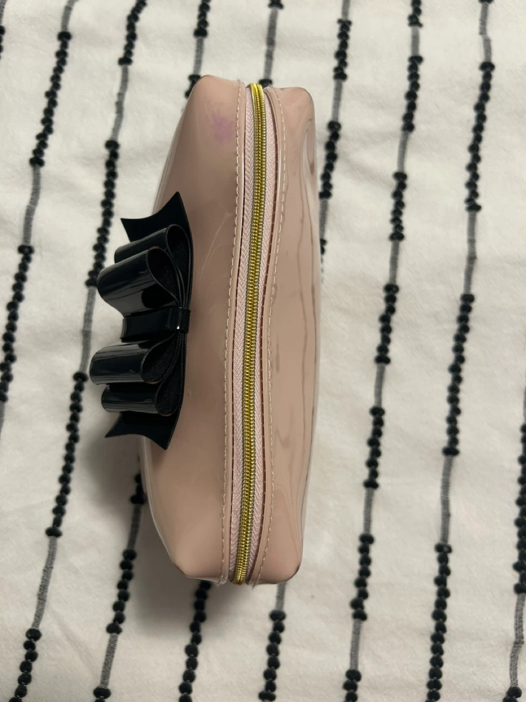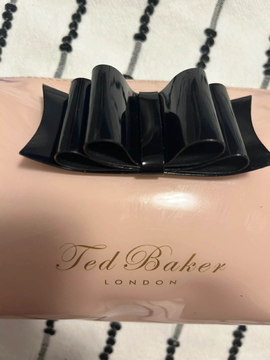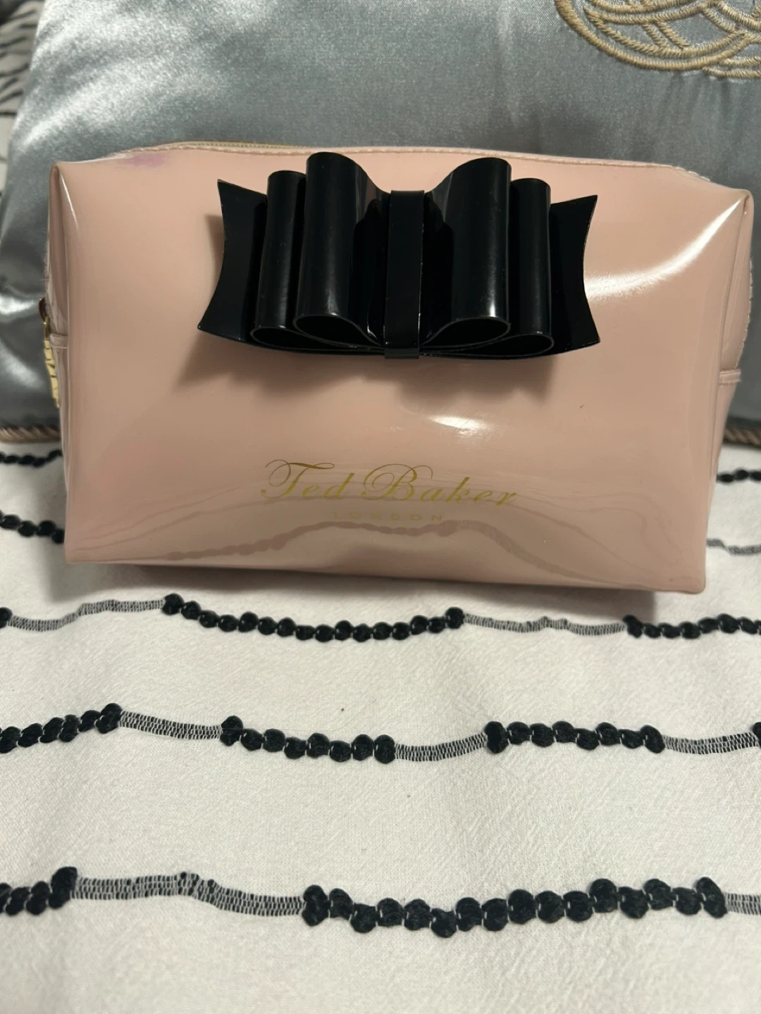 This Ted Baker cosmetic bag is made of shiny pink patent material and features a black bow accent. It has a zippered closure and a gold-tone zipper pull. It's a great size for carrying makeup or toiletries. 17 cm X 12 cm