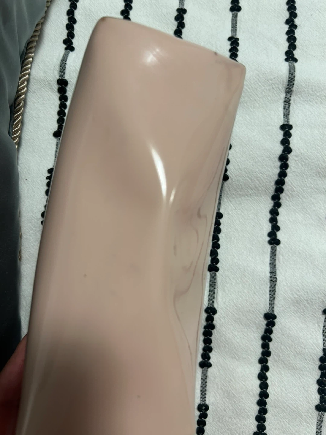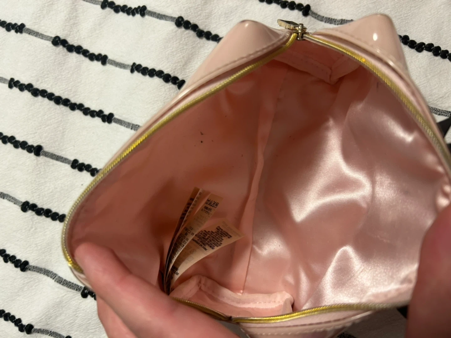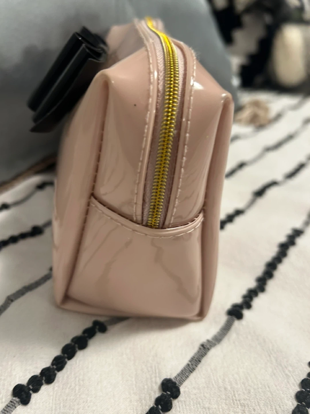 This Ted Baker cosmetic bag is made of shiny pink patent material and features a black bow accent. It has a zippered closure and a gold-tone zipper pull. It's a great size for carrying makeup or toiletries. 17 cm X 12 cm