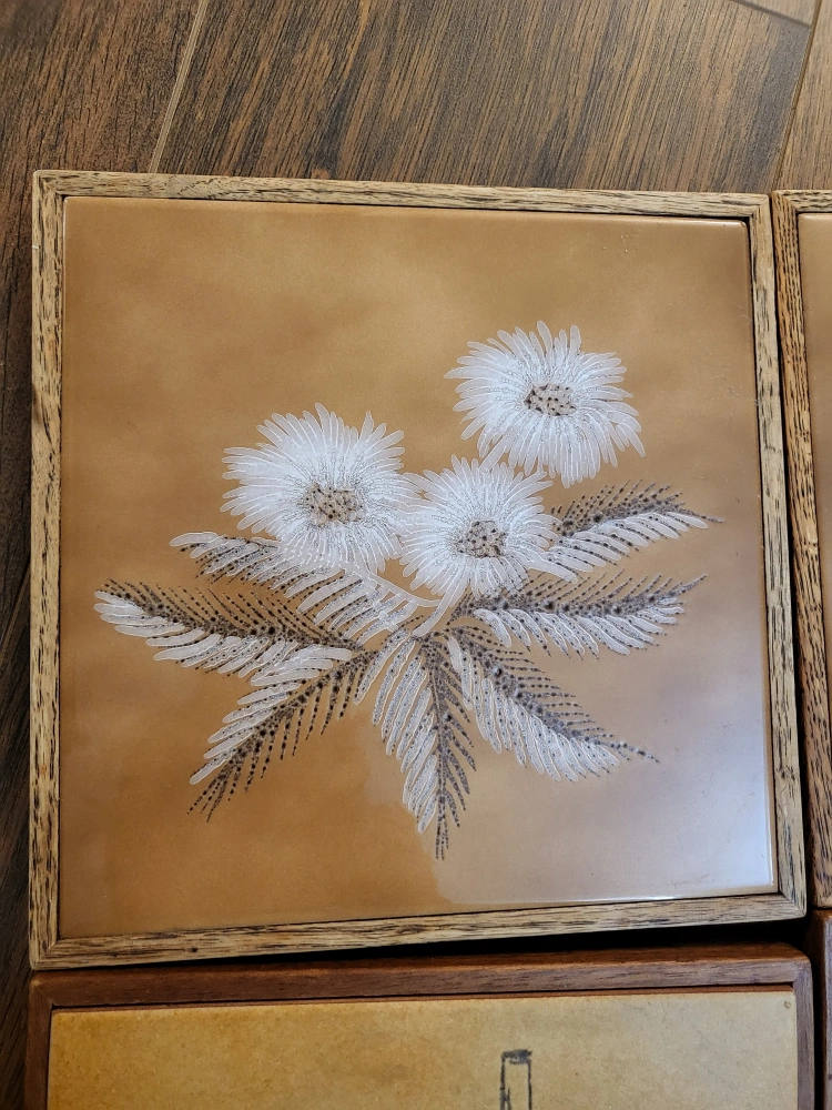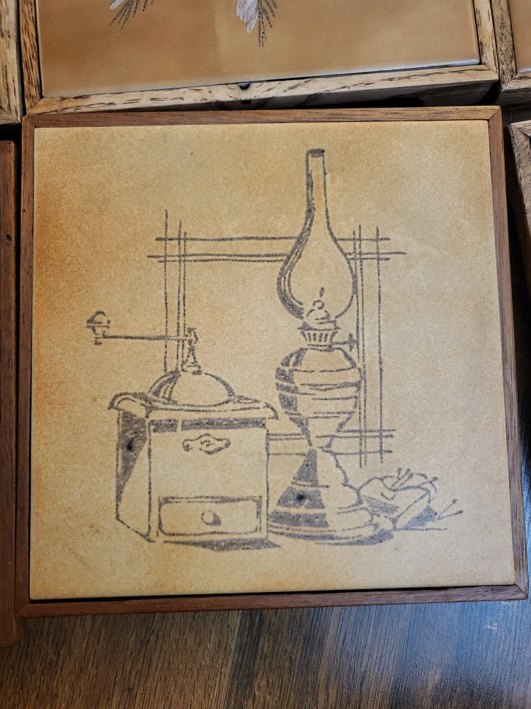 Set of six vintage ceramic tiles. Wooden frames. Made in Italy. $6/each or take all 6 for $30.