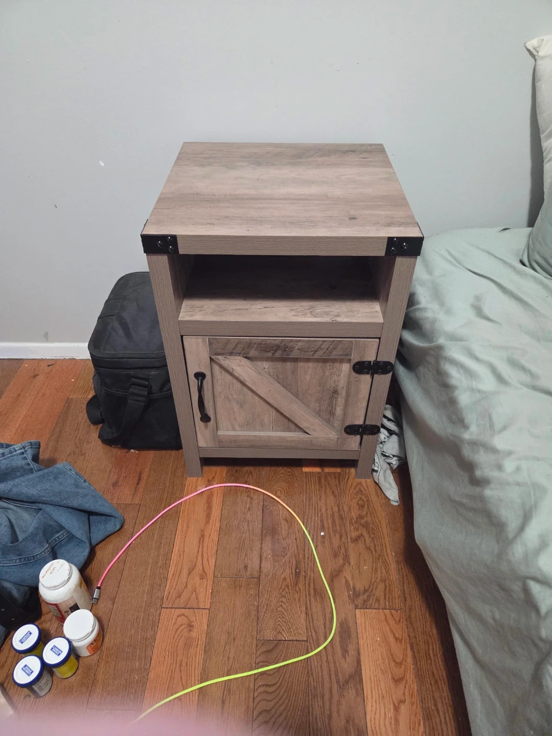 Selling a wood nightstand in good condition! It features a barn door style on the cabinet and an open shelf for storage. Perfect for adding a rustic touch to your bedroom