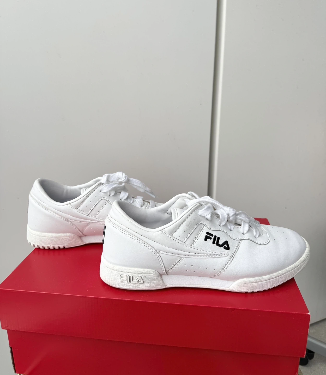 Size: US 7 / EUR 38 / UK 4 1/2 Happy to provide any measurements upon request 📏 ✨ Retail price: ~$90–$110 + tax 💸 My price: 60$ Condition: Excellent ! Worn once. Gently washed and kept them clean!🧼 Description: • Retro-inspired design with a clean, modern twist • Smooth polished leather upper with perforated detailing • Seamed overlays + classic FILA branding on the side and heel • Low-profile, lace-up silhouette for a sleek everyday look • Cushioned EVA midsole + durable rubber outsole for excellent traction • Easy to maintain — just wipe clean These sneakers are perfect for everyday wear — comfy, stylish, and go with literally everything. Great for school, casual outfits, errands, or anyone who loves a clean white aesthetic 👟✨ You’re welcome to try them on before buying :) 🤝🏻 Price is negotiable. 📍 Meet anywhere in GTA/Toronto or can ship 📦 Message me for more details! Check out my other listings ♥️ Thanks!