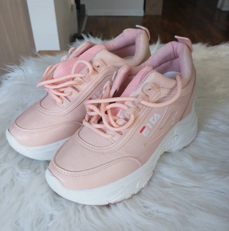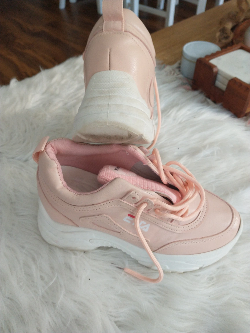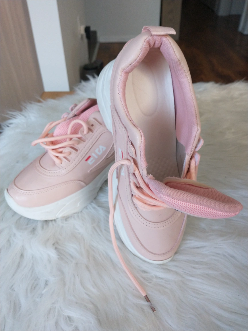 153Selling a pair of gently used Fila sneakers in a lovely pink colour! They are a European size 38. These sneakers are perfect for adding a touch of style to your everyday look. They have a chunky sole and the classic Fila logo on the side