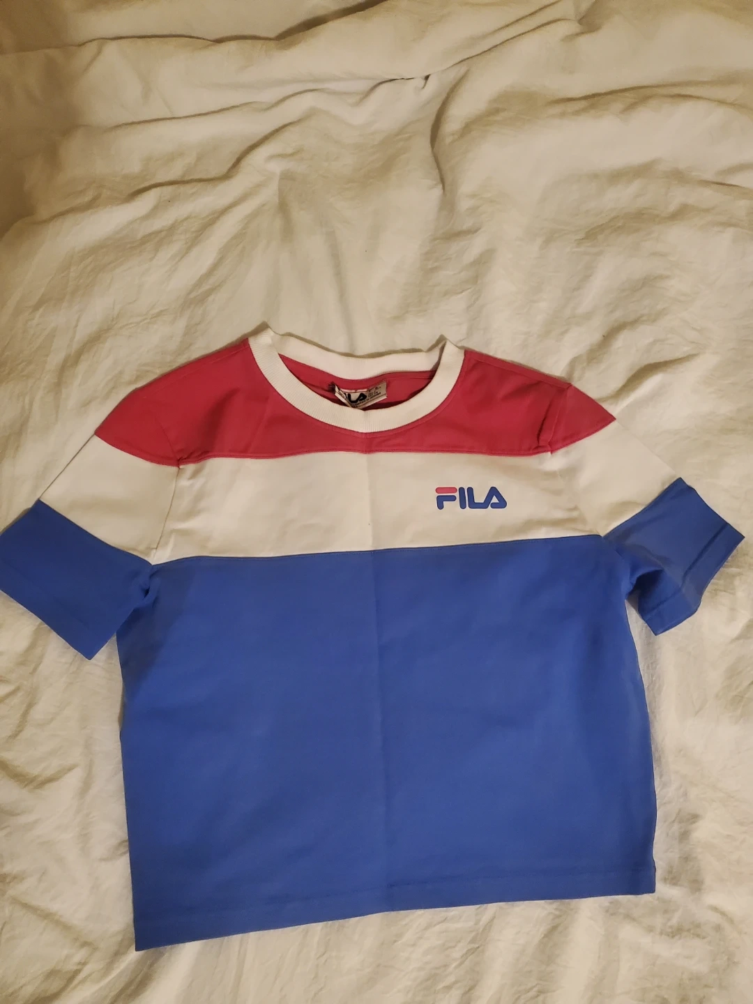 10Cute Fila t-shirt with a Pink, white, and blue colour block design! It's in great condition and ready for a new home