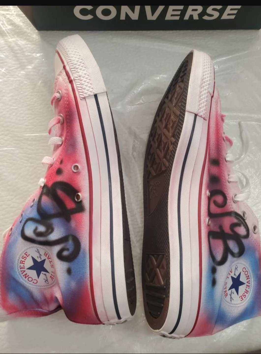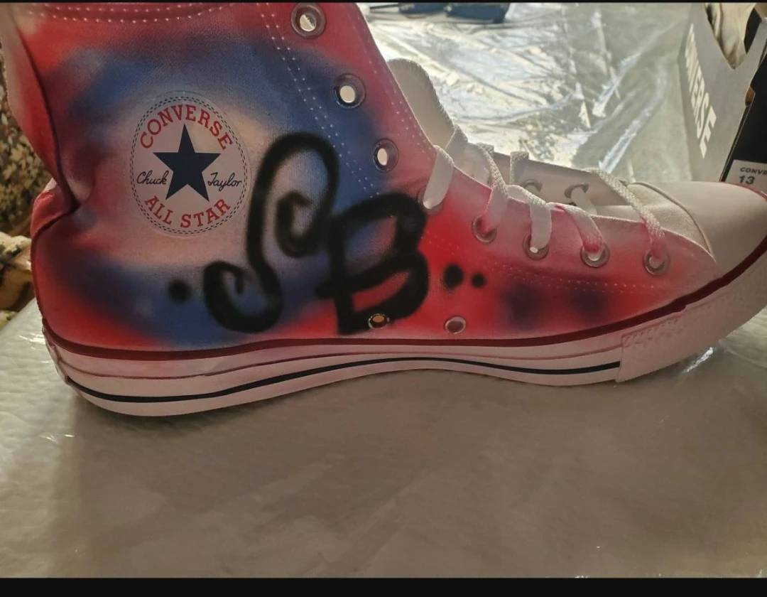 New converse All star High Top with graffiti one one side of each sneaker.. Size 13 mens or 15 womens. This is selling for $65 online without the graffiti. $40 great price.