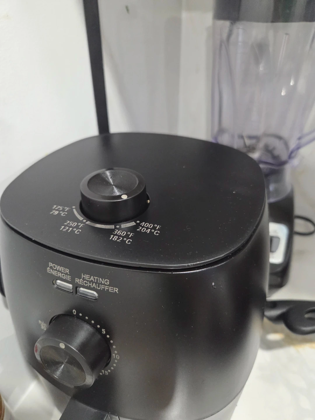 Mainstays 2L air fryer. It has a timer up to 30 minutes and temperature settings from 175°F to 400°F. The basket and tray are dishwasher safe.
