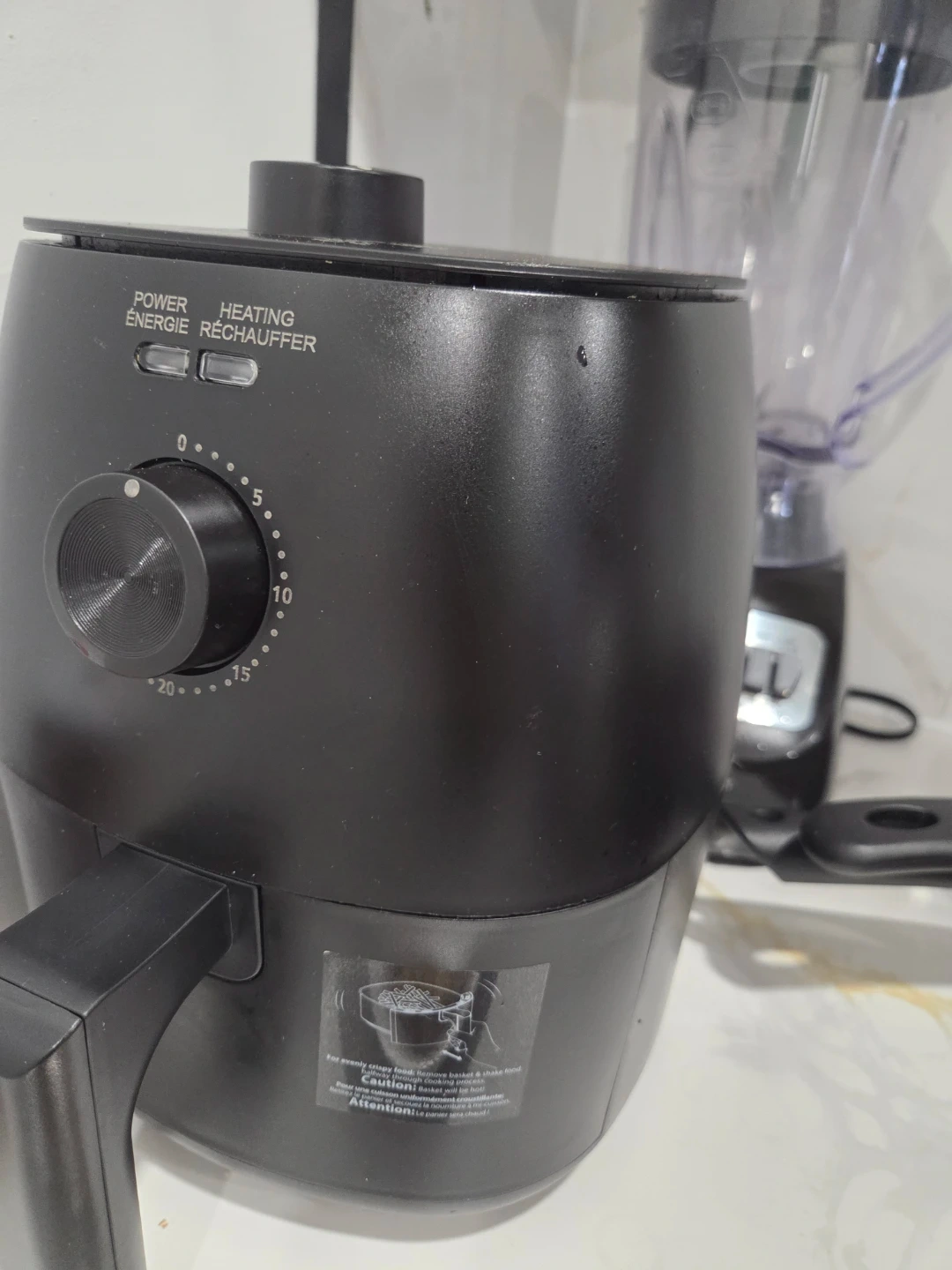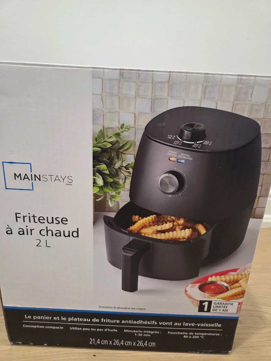 Mainstays 2L air fryer. It has a timer up to 30 minutes and temperature settings from 175°F to 400°F. The basket and tray are dishwasher safe.