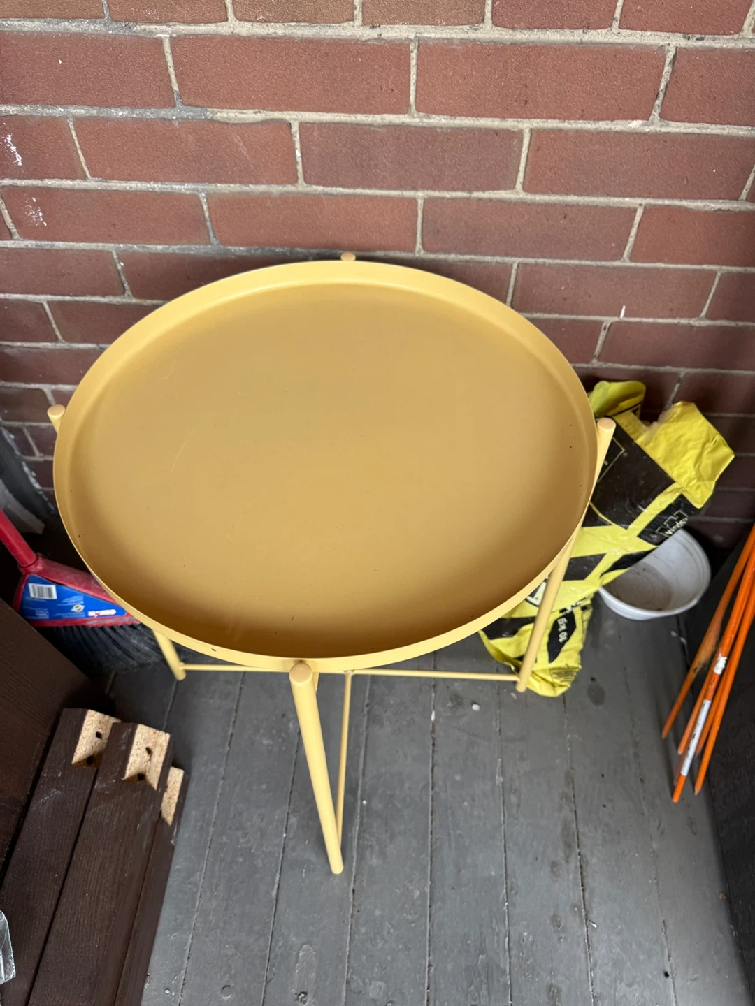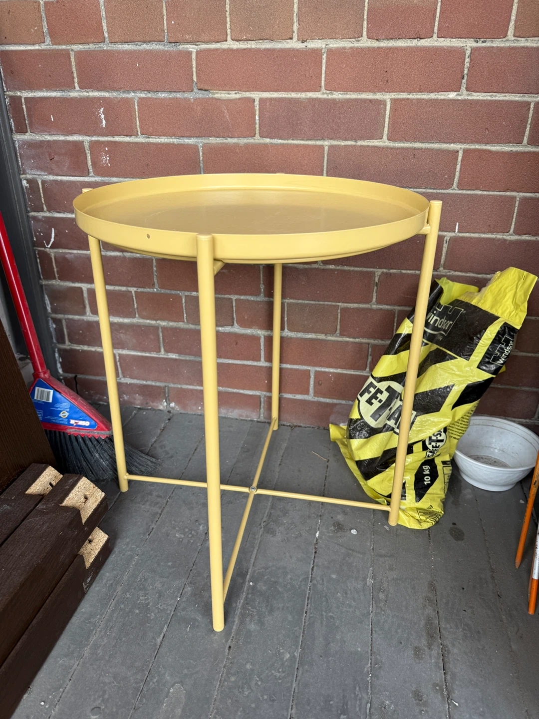 A simple yellow side table with a round top. Its metal construction makes it durable for everyday use. This table's compact size is great for small spaces!