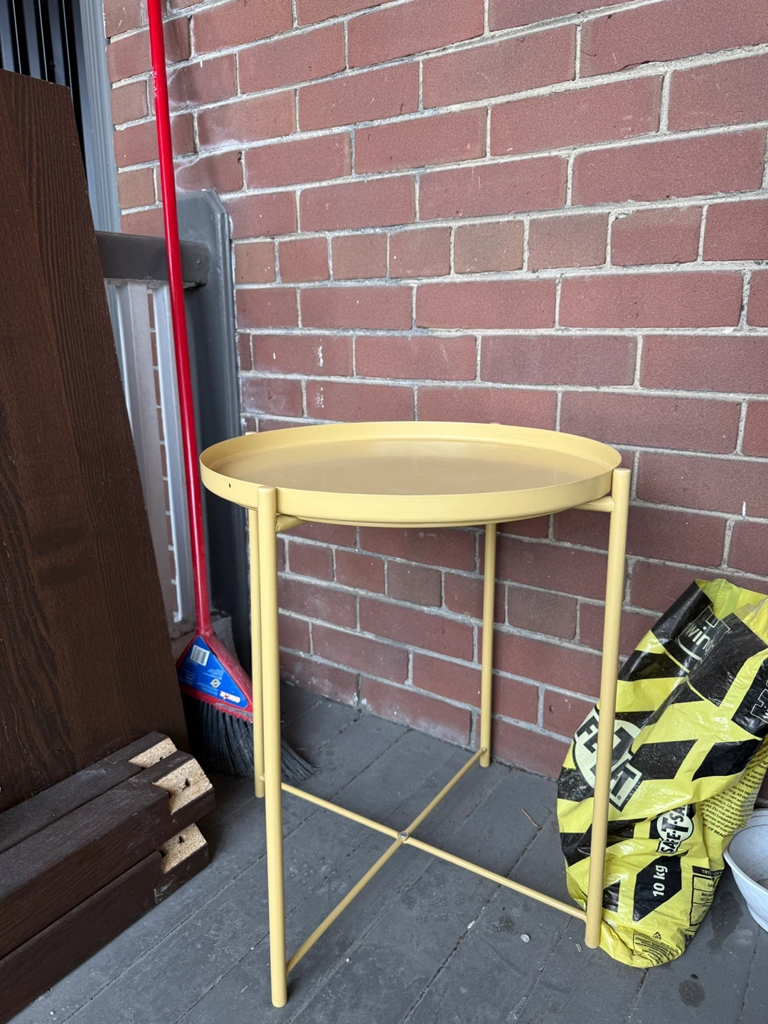 A simple yellow side table with a round top. Its metal construction makes it durable for everyday use. This table's compact size is great for small spaces!