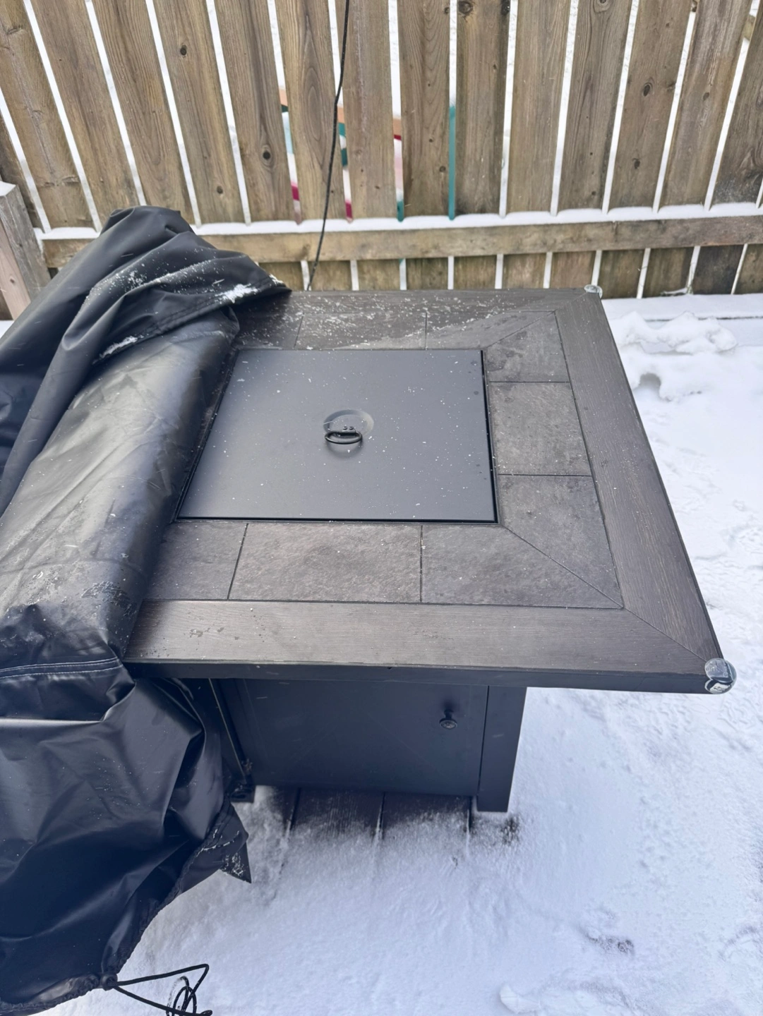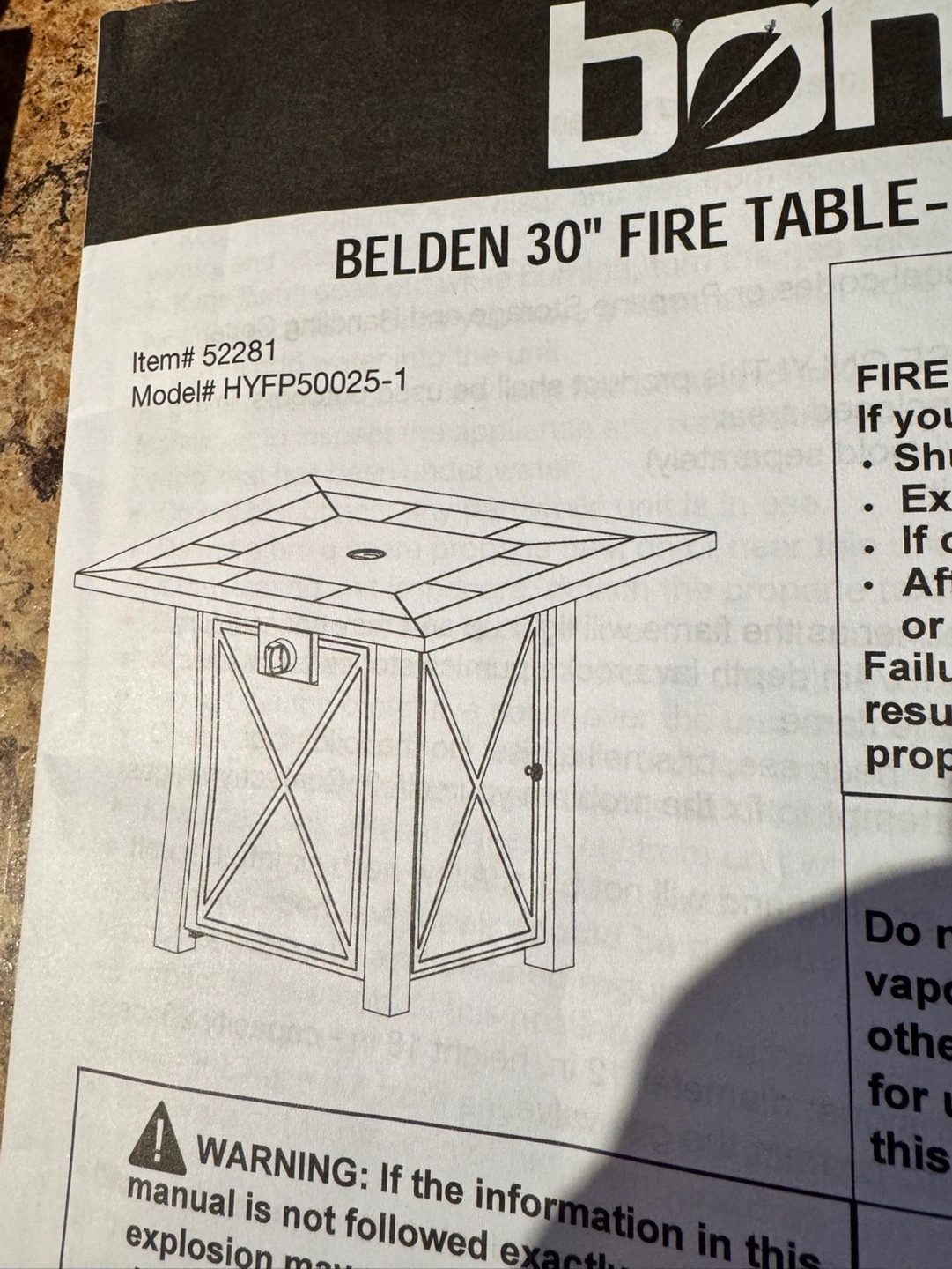 Mint condition 50,000 btu fire table. Used twice last summer and stored until now. Selling only because we are moving and cannot take it. Comes with a brand new 20 pound propane tank with propane and a gauge. This was bought separately. Brand new and was 349.00 plus tax when bought