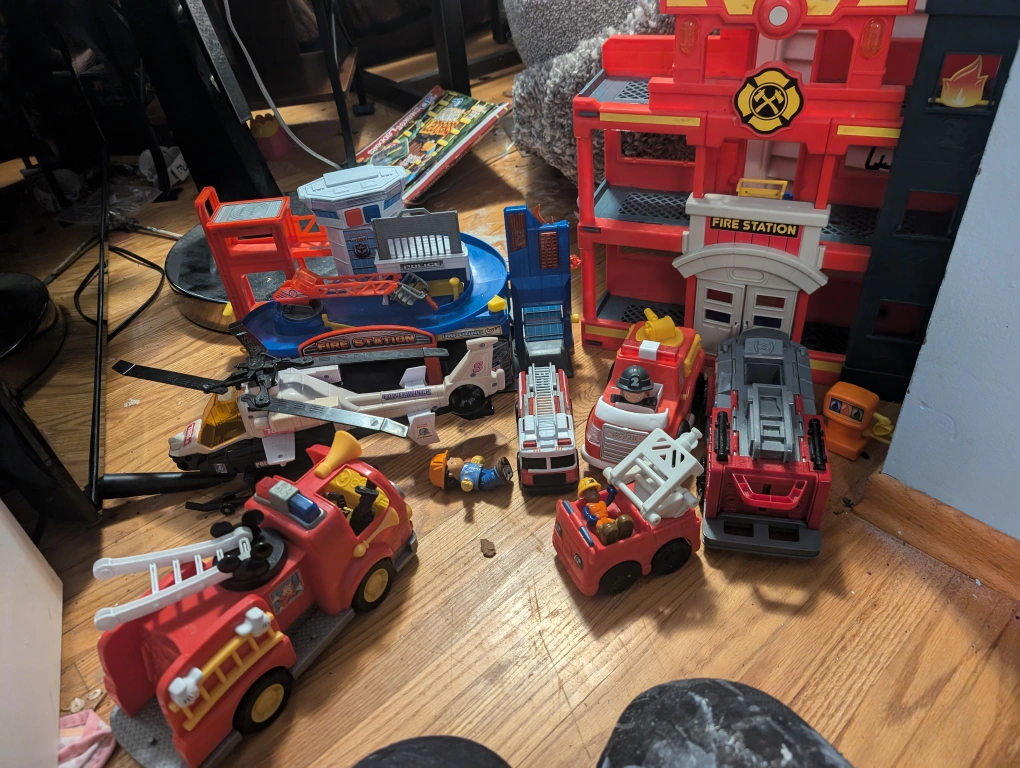 Selling a fire station toy set! It includes a fire station, a helicopter, and several fire trucks. Great for kids who love playing with vehicles and creating rescue scenarios