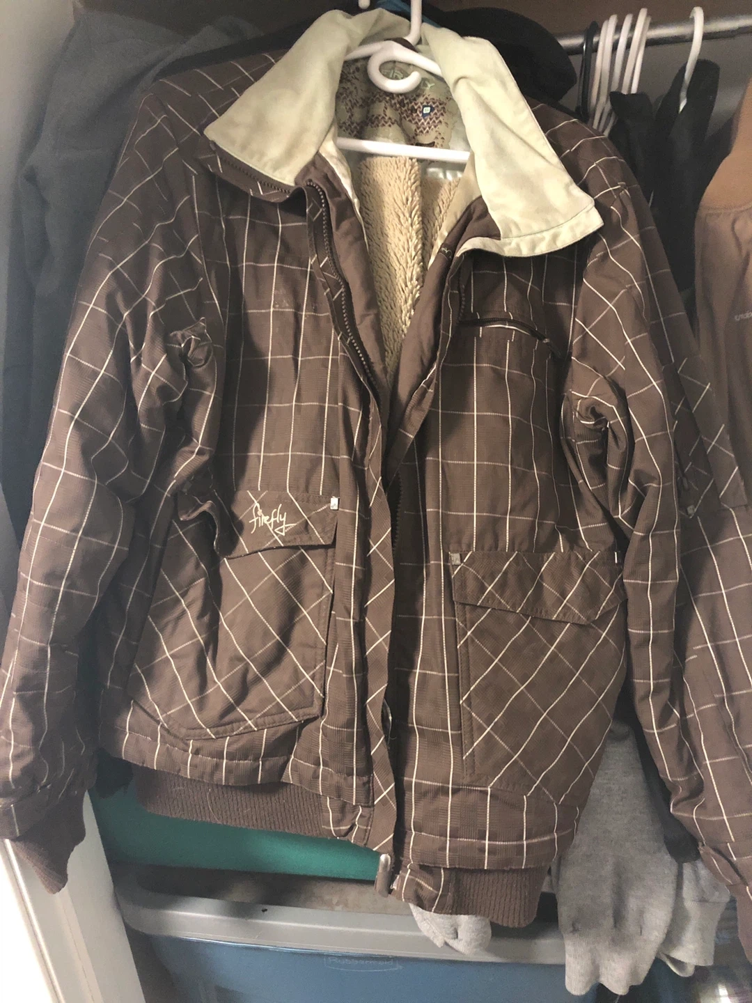 60Here's a Firefly jacket up for grabs! It's a stylish brown colour with a plaid pattern. Perfect for layering up when the weather gets a bit chilly. Fits more like a size large