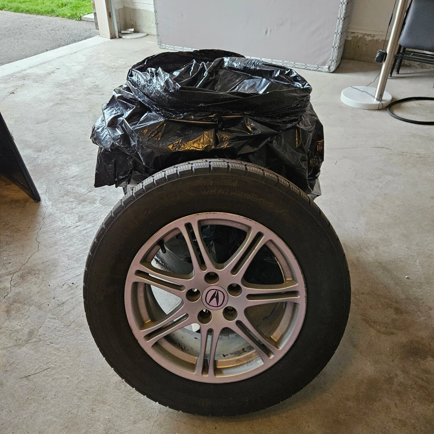 Selling a used Firestone WeatherGrip tire, size 225/65R17. It has a load index of 102H and is marked M+S. The tire is mounted on a wheel with an Acura logo.