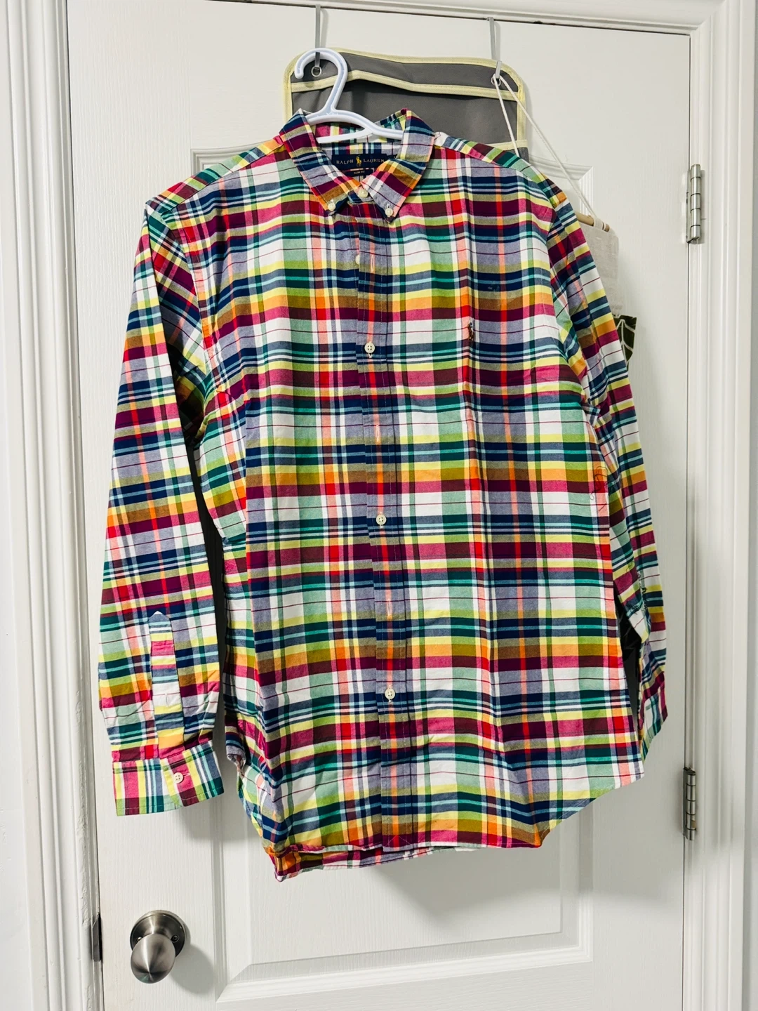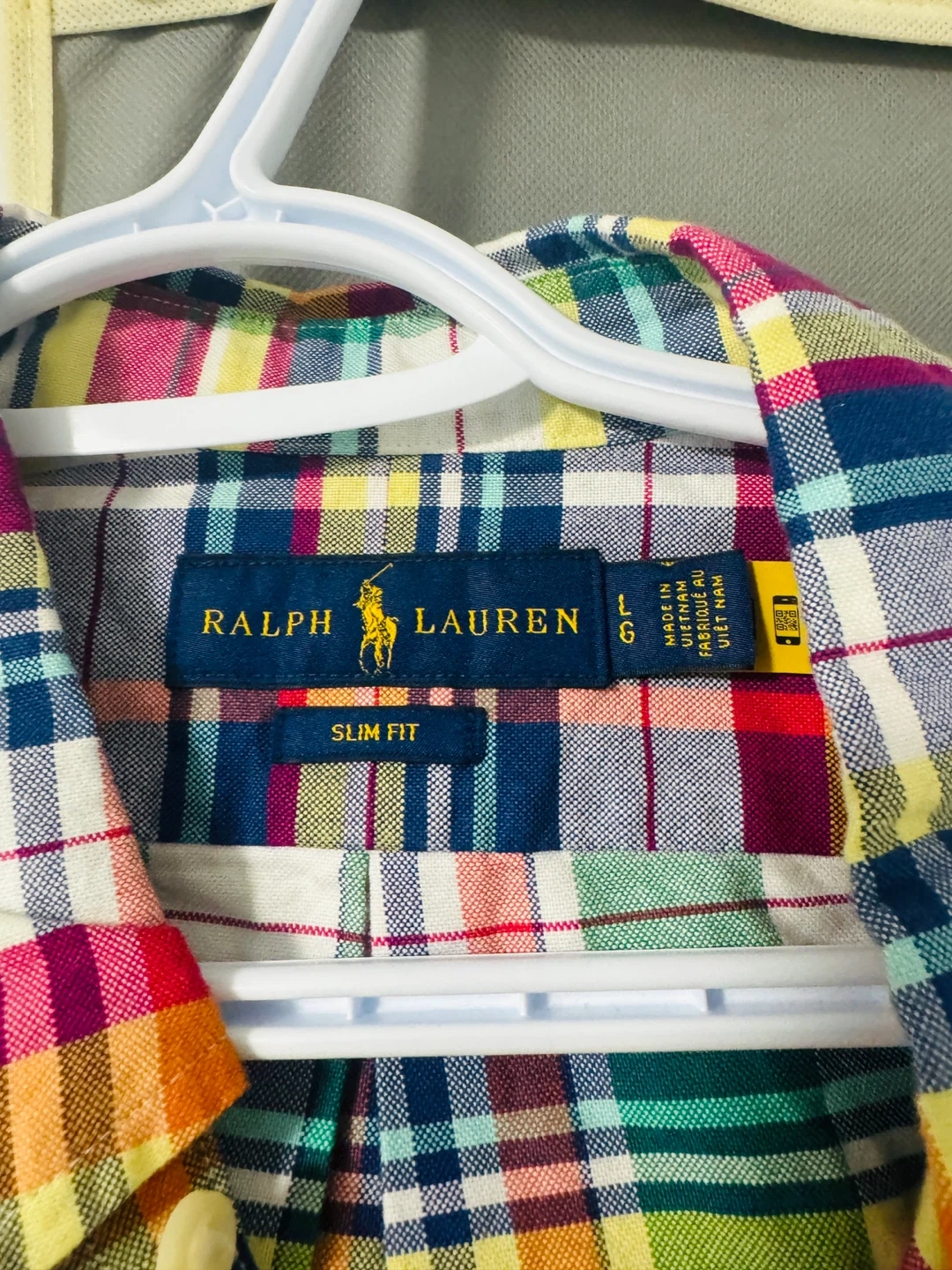 Here's a colourful Ralph Lauren slim fit shirt in size large! It has a fun plaid pattern that's perfect for adding a pop of colour to your wardrobe