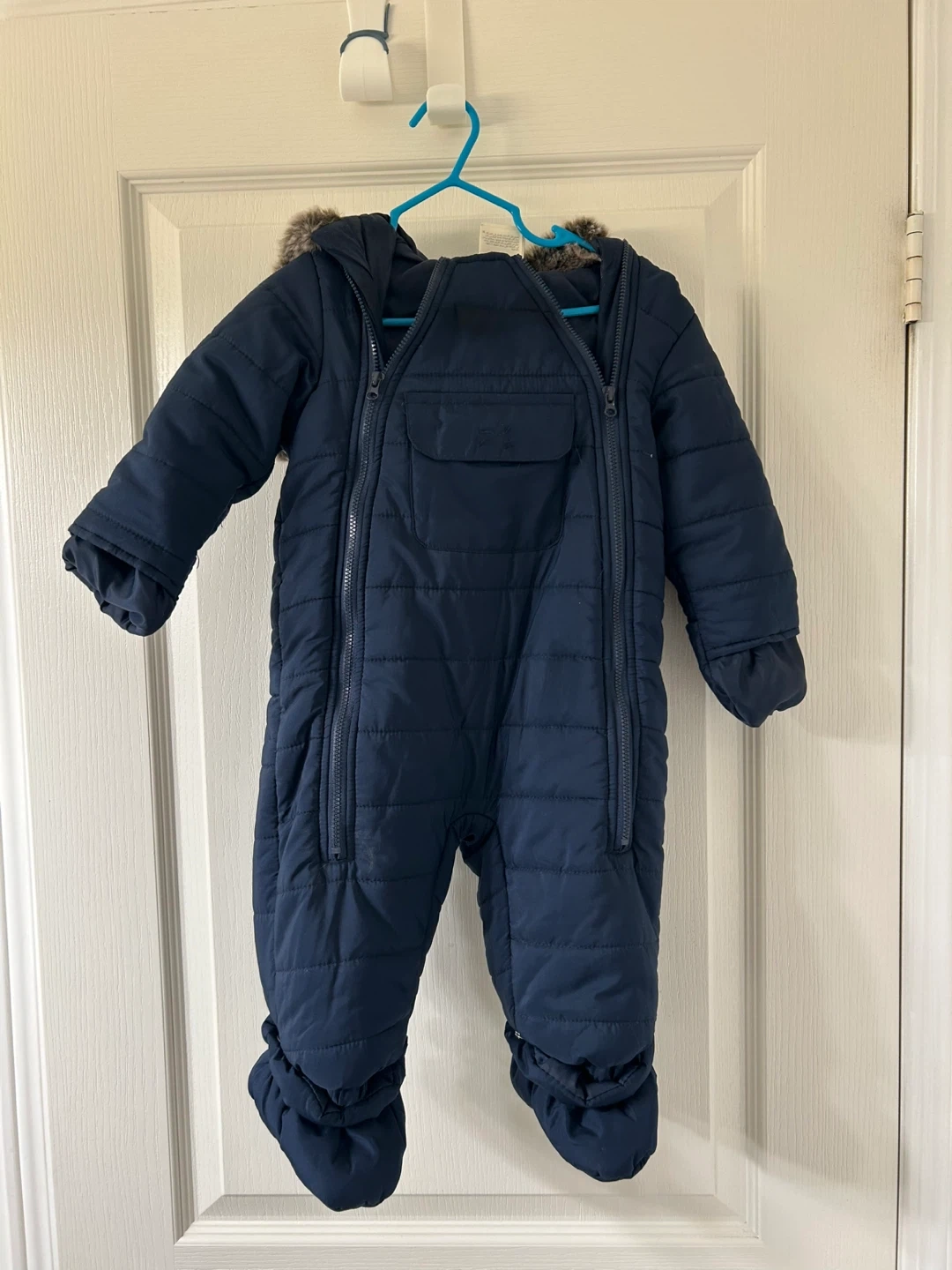 18Selling a gently used snowsuit from First Impressions, perfect for keeping your little one warm this winter! It's in great condition and sized for 6-9 months (17-22 lbs). The outer shell and filling are 100% polyester, with a faux fur trim that's 75% acrylic and 25% polyester. The colour is a lovely navy blue, perfect for any little one