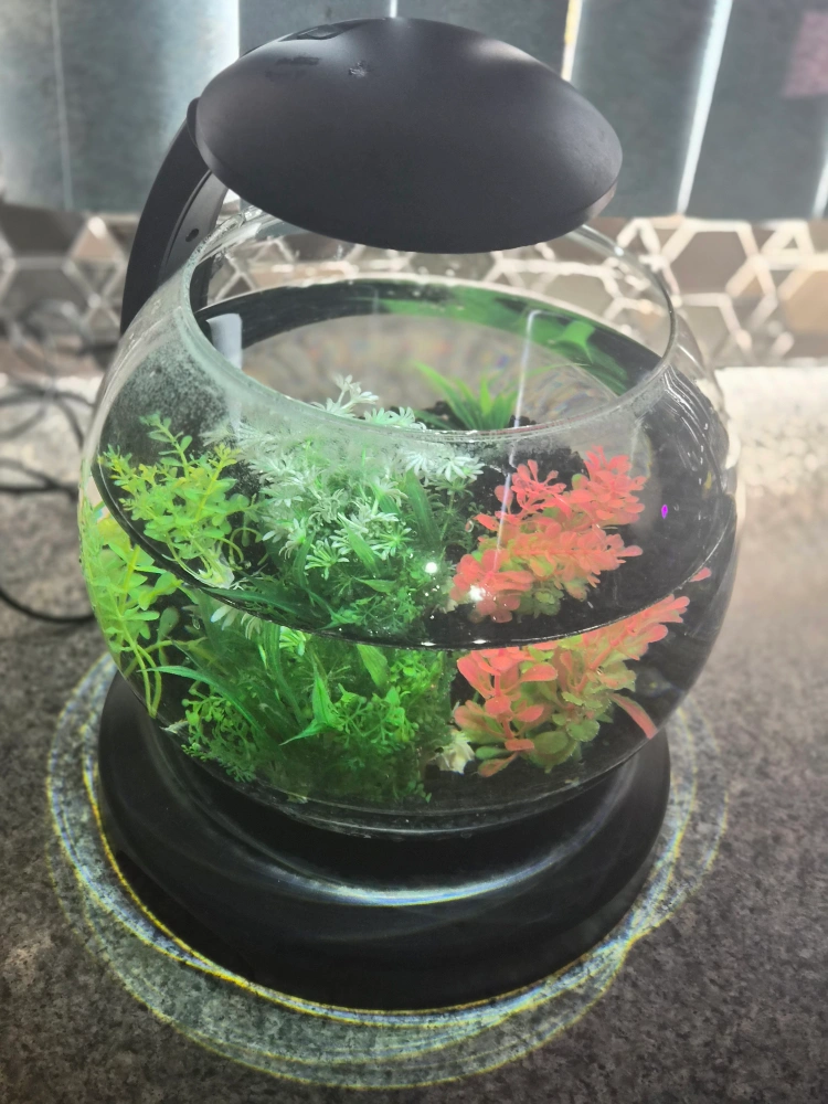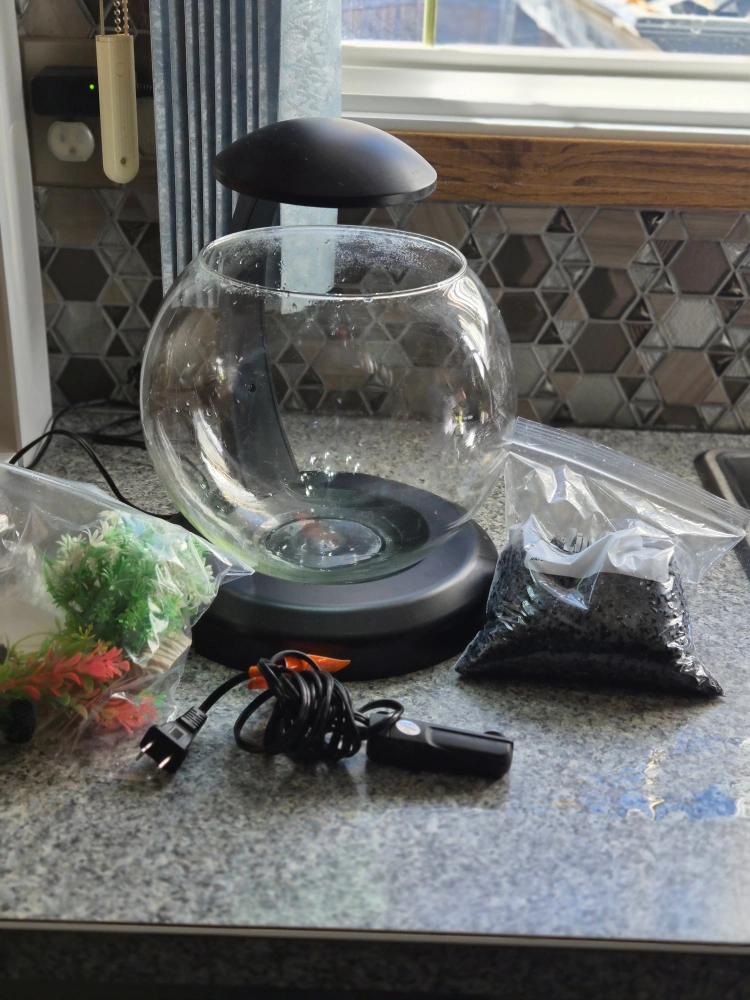 Fish Bowl with Accessories – Great for Shrimp! Beautiful glass fish bowl setup perfect for shrimp or small aquatic pets. Comes with colorful fake plants, black gravel, a mini heater with holder, and a built-in light. Everything works great and is ready to go — just add water and your shrimp!