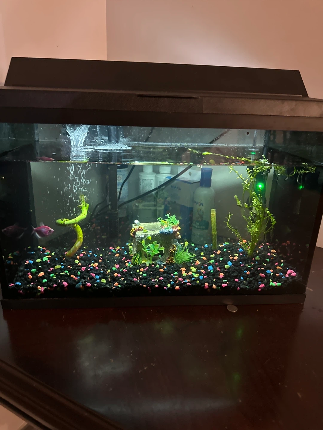 60Selling a used fish tank. It comes with gravel, decorations, plants and 2 glow fishes. Perfect for someone looking to start their own aquarium!