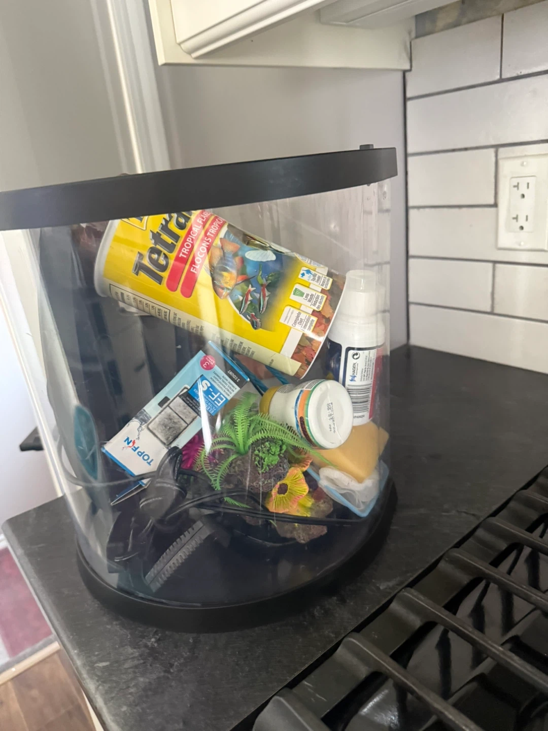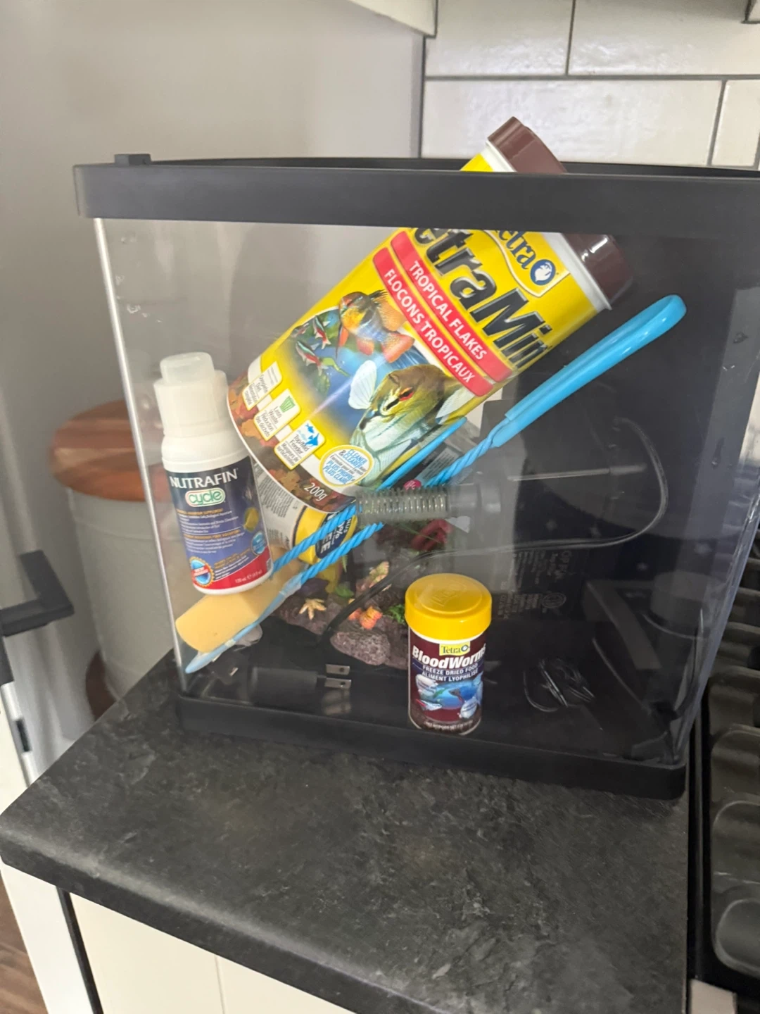 Selling a fish tank that comes with TetraMin tropical flakes, Nutrafin Cycle, and bloodworms. Also includes decor and cleaning supplies