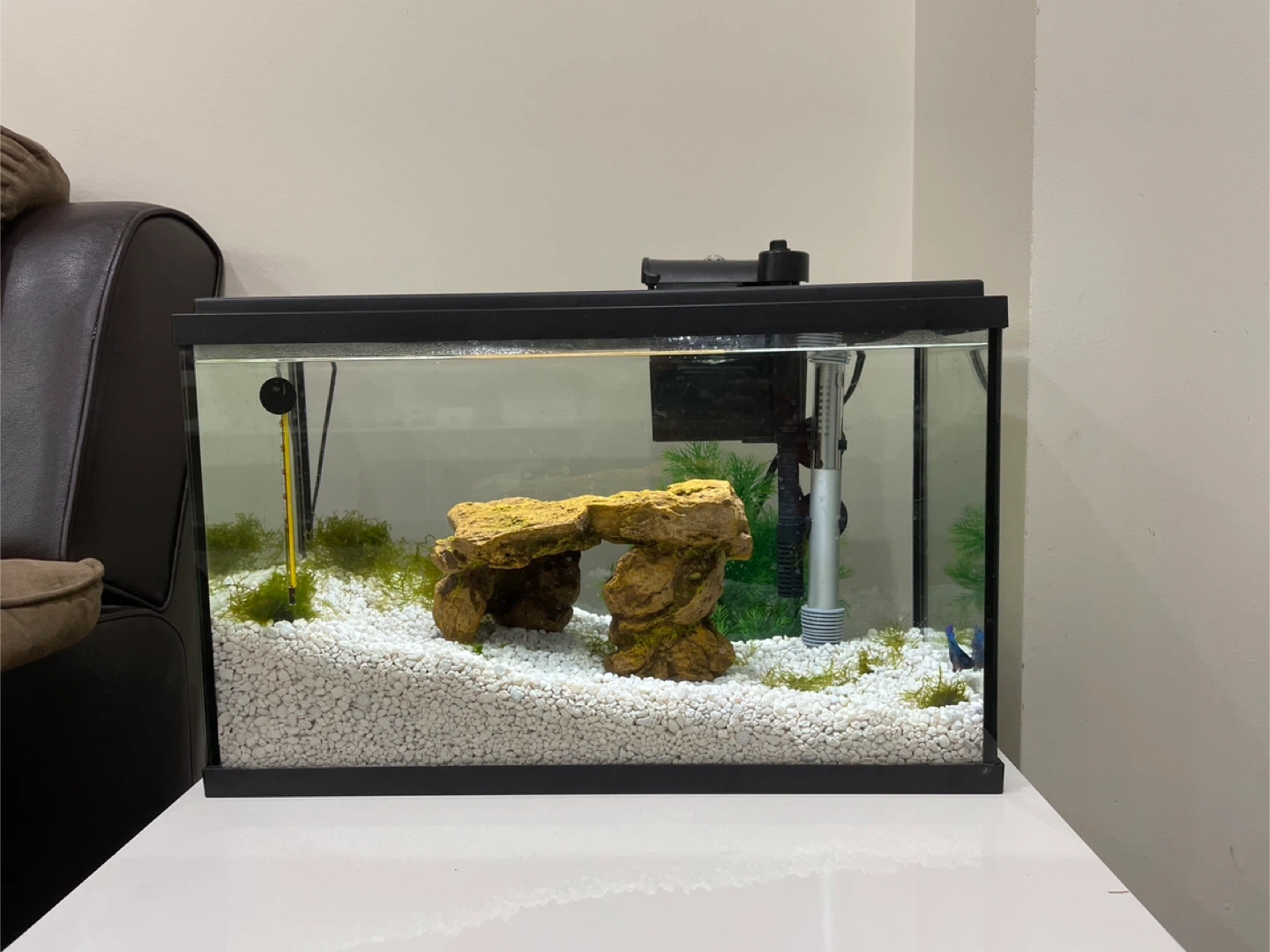 70Selling a used fish tank that's ready to go! It comes with gravel, a decorative rock structure, a filter, a heater, a thermometer, and some plants. Perfect for getting started with a new aquatic friend π₯
