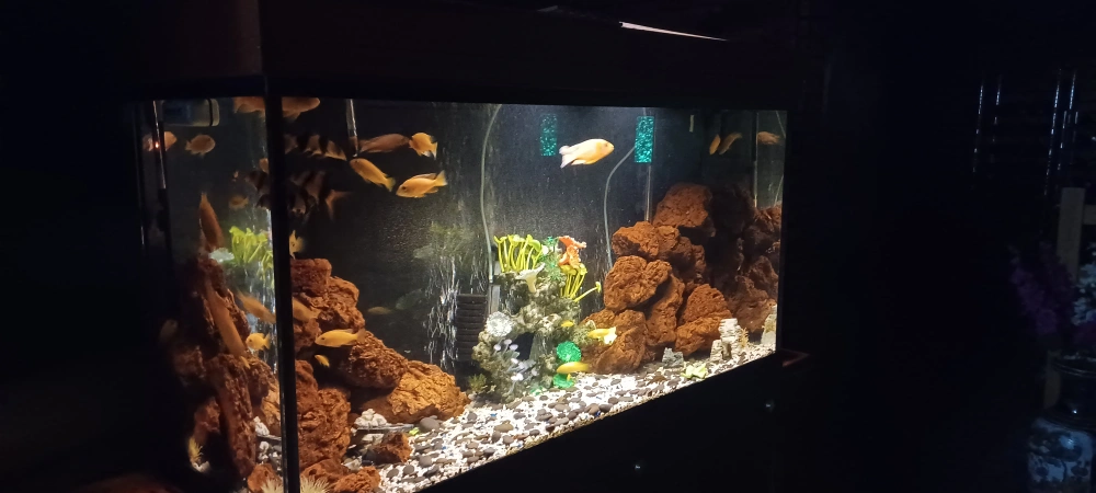 Large fish tank, stand, and wooden cabinet included. Multiple fish included. Filter visible in image. Cabinet has multiple drawers and doors. Great condition. We paid over $1200 PLEASE CALL NOT TEXT.... 519 729-5862 415 Victoria st south kitchener