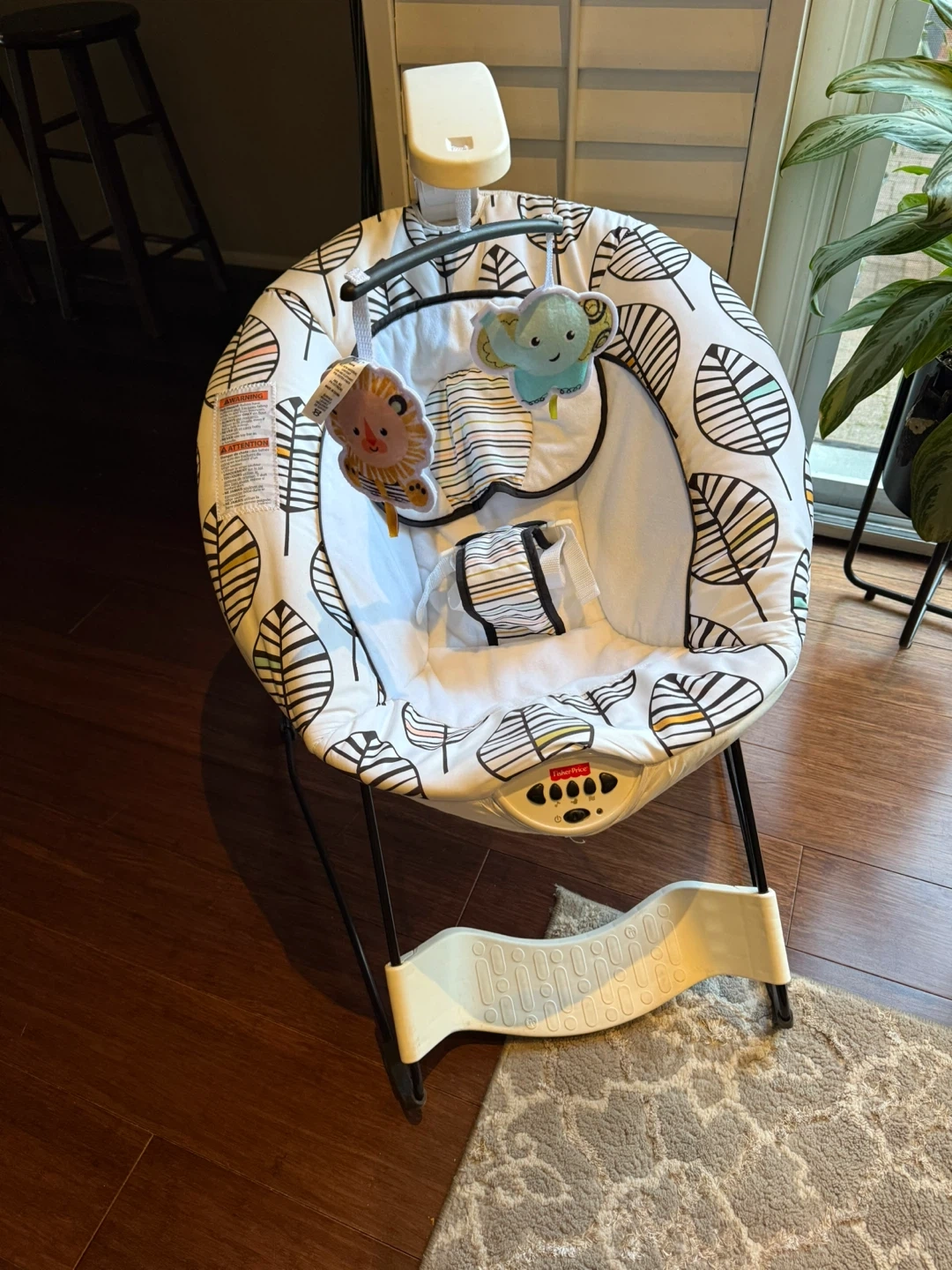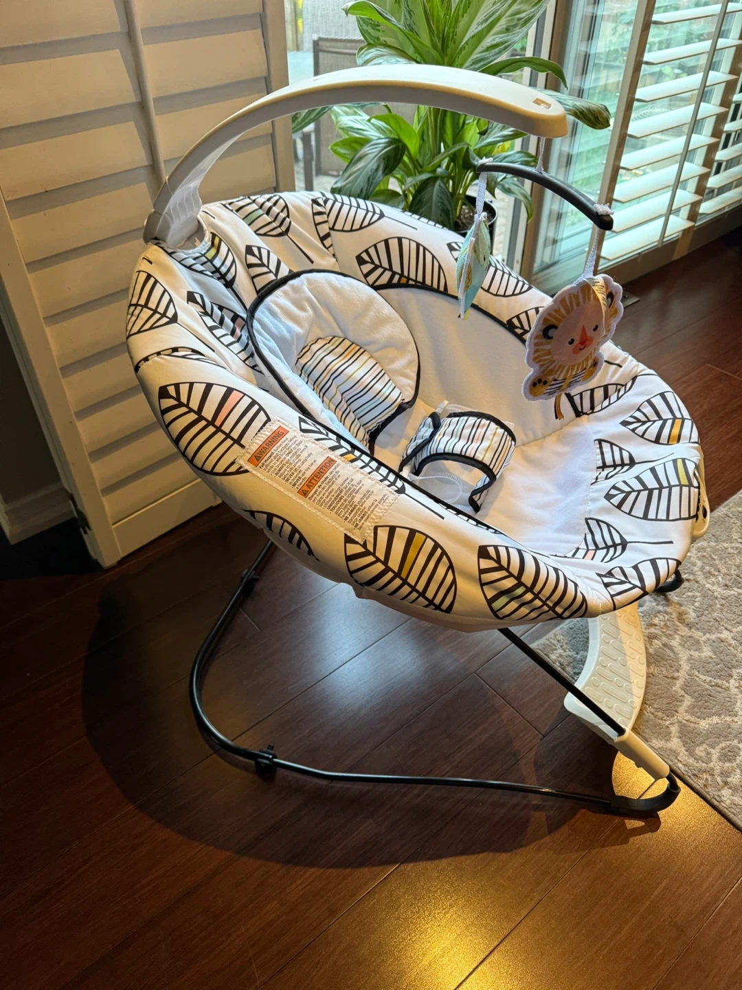 Selling a Fisher-Price baby bouncer in great condition! It features a comfortable seat with a cute leaf pattern and includes hanging toys to keep your little one entertained. Perfect for soothing and playtime!