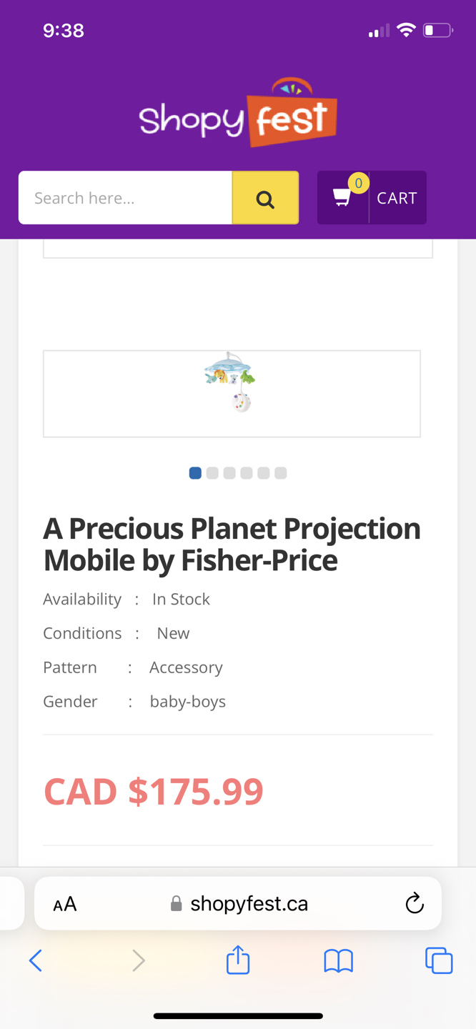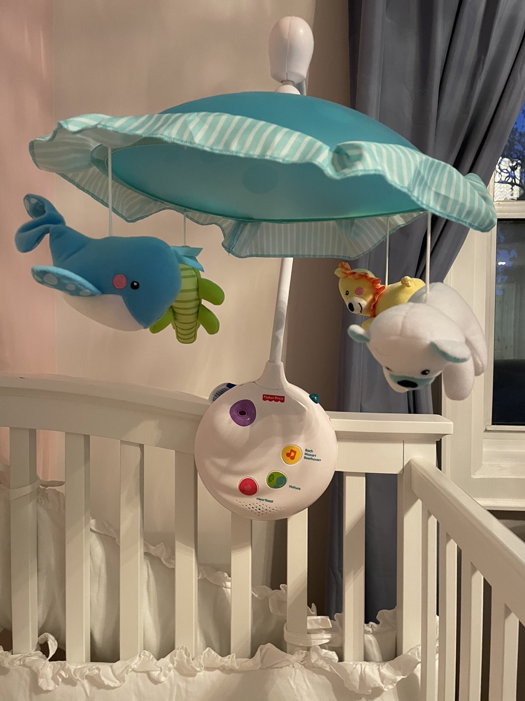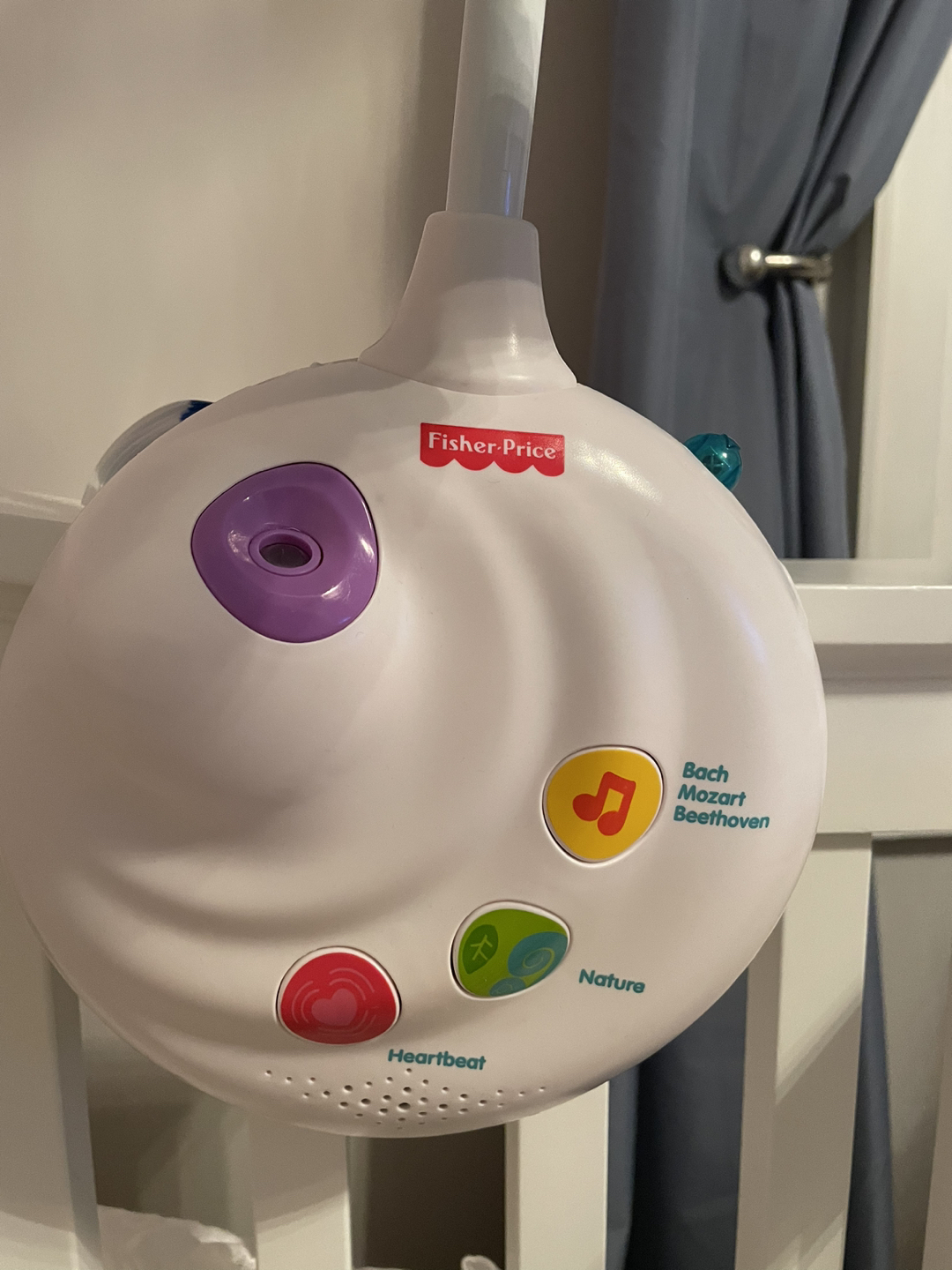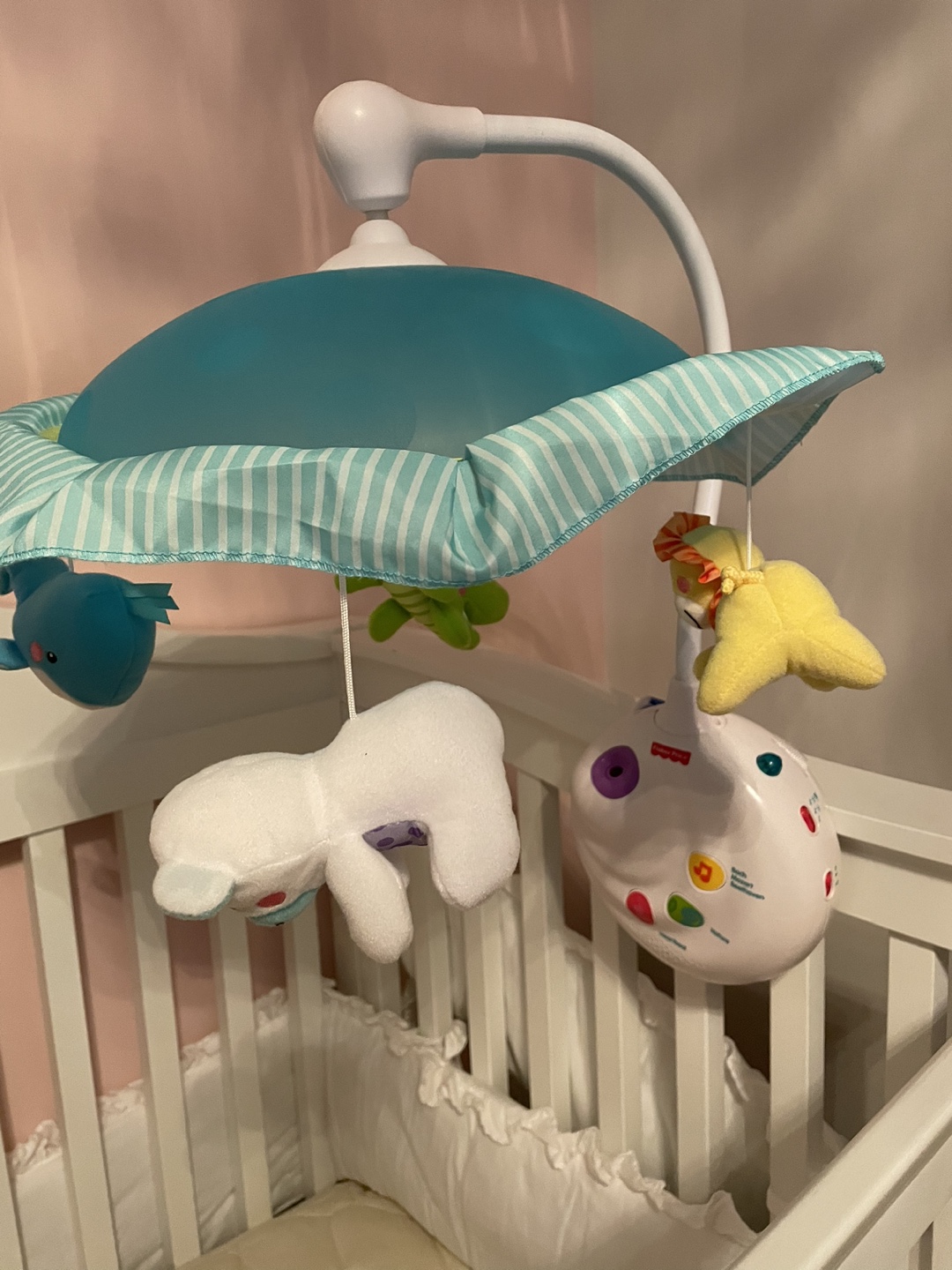 25Original price is 155$+tax A Precious Planet Projection Mobile by Fisher-Price Product highlights Long-lasting valueconverts to crib-side music box with ceiling projection Close-up images on canopy projection make it easier for newborns to focus Music & soothing nature, heartbeat and womb sounds play for up to 20 minutes without disturbing baby Includes classical lullabies (Bach, Mozart & Beethoven) Adorable animal friends spin & smile, keeping baby company Customize with three musical settings: Long-playing musicup to 20 minutes; Music with motion; Music, motion & projection
