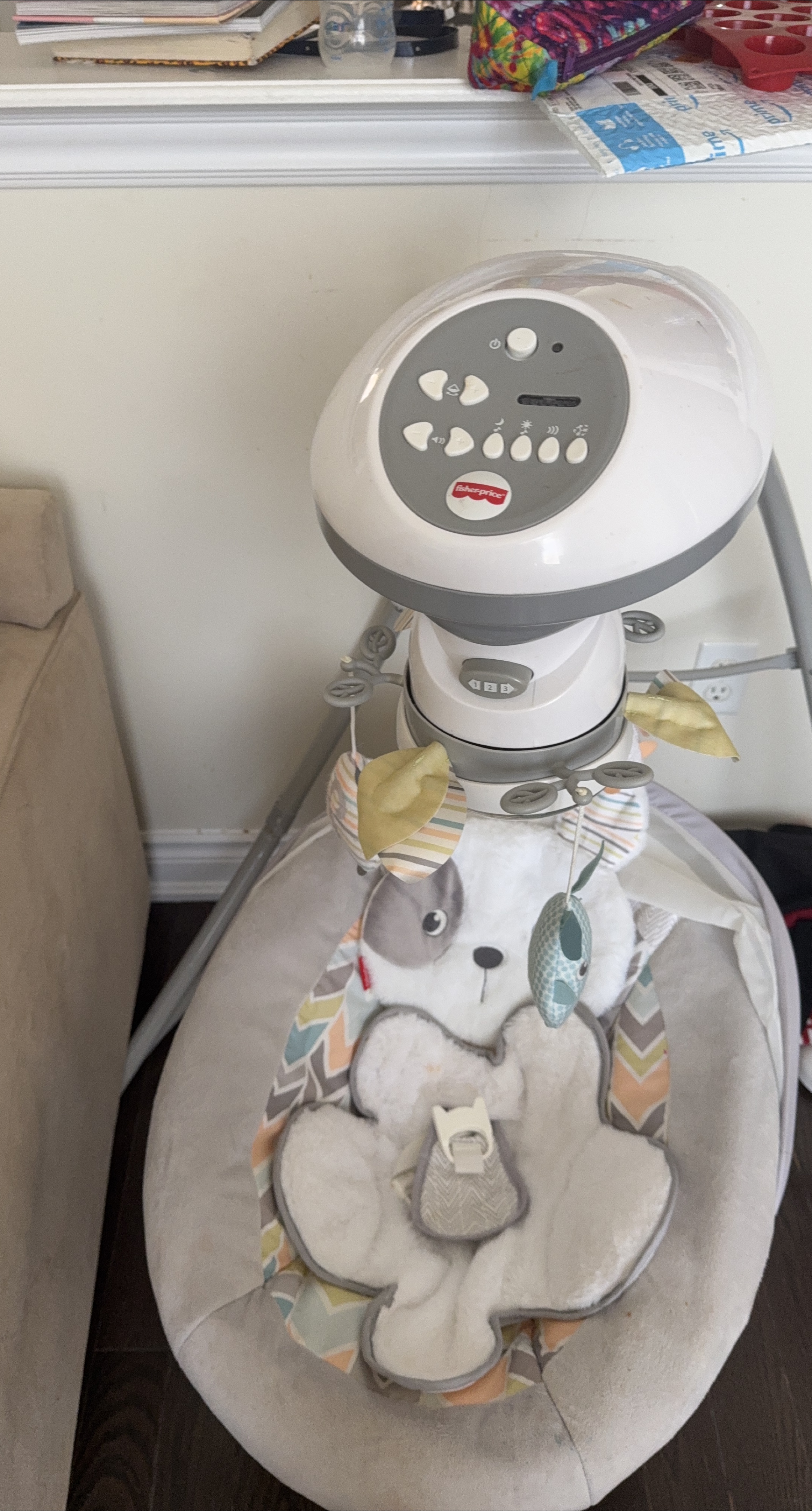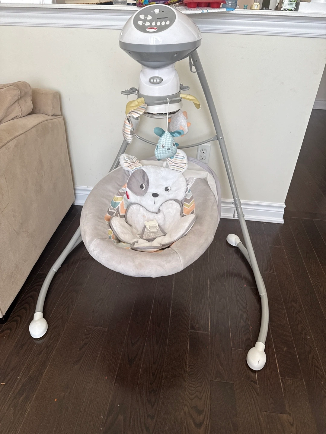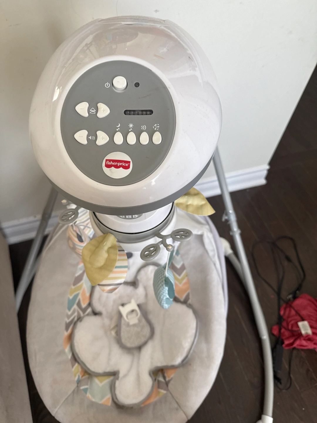 Selling a Fisher-Price baby swing. It's in great condition and ready for a new home! The swing features a variety of settings and sounds to soothe your little one. It also includes cute plush toys to keep them entertained.