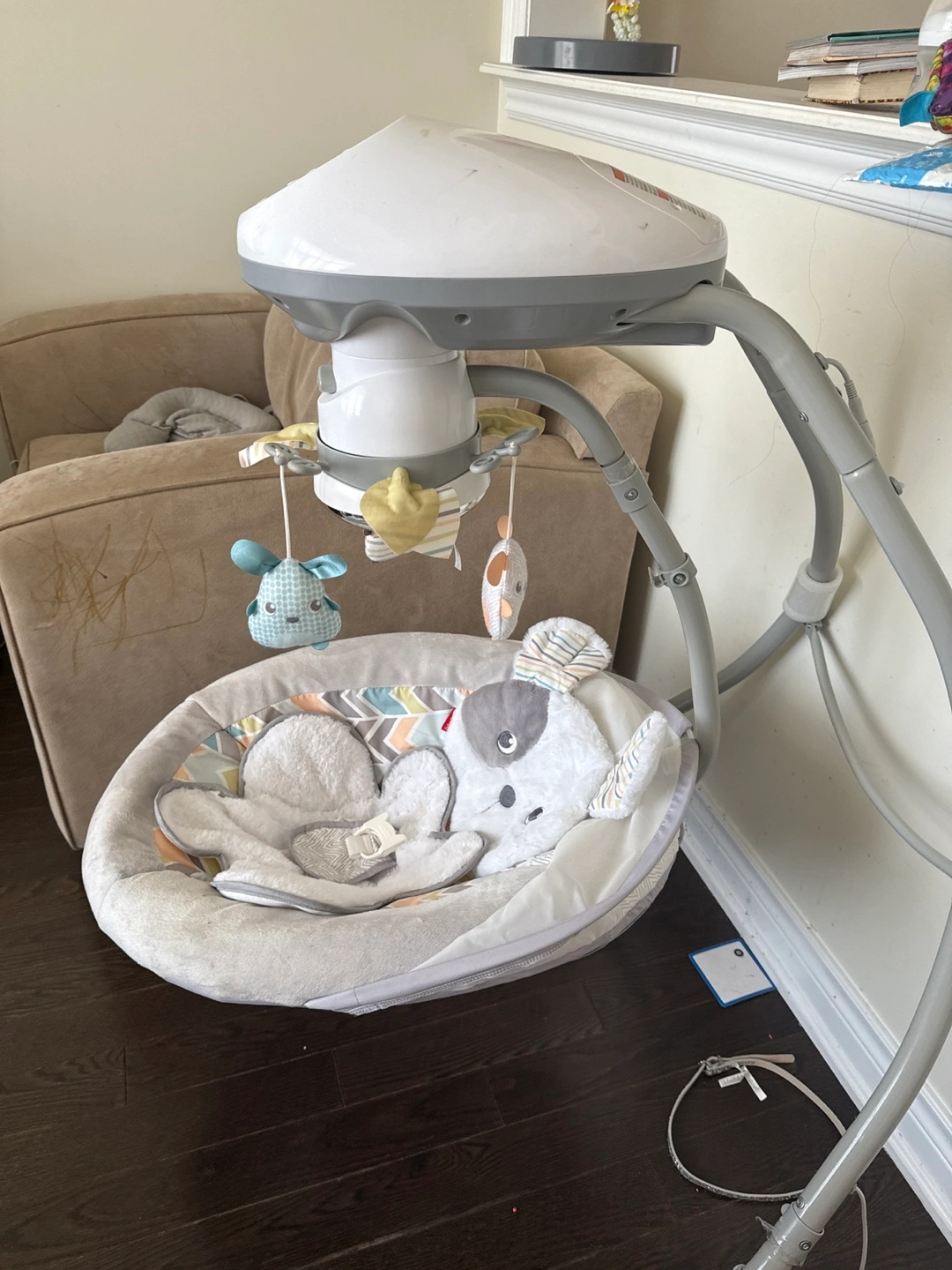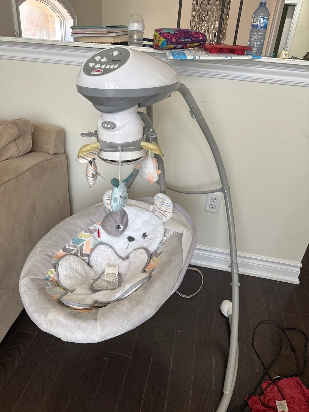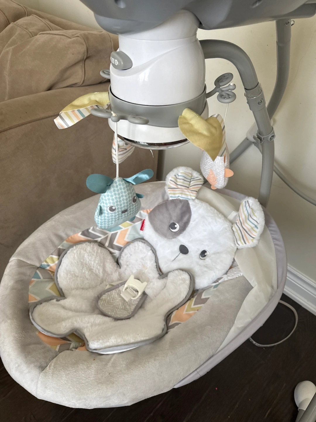 Selling a Fisher-Price baby swing. It's in great condition and ready for a new home! The swing features a variety of settings and sounds to soothe your little one. It also includes cute plush toys to keep them entertained.
