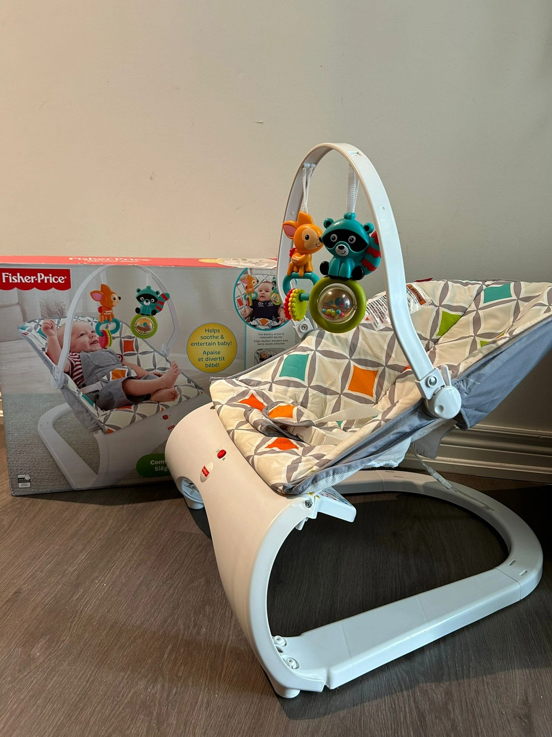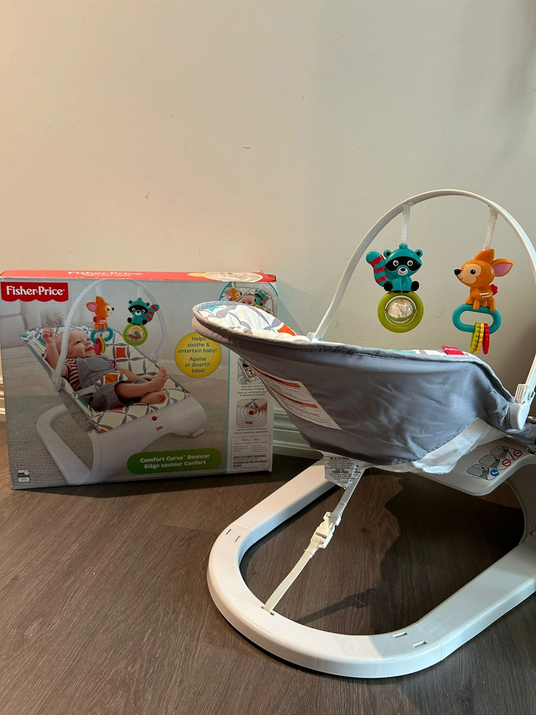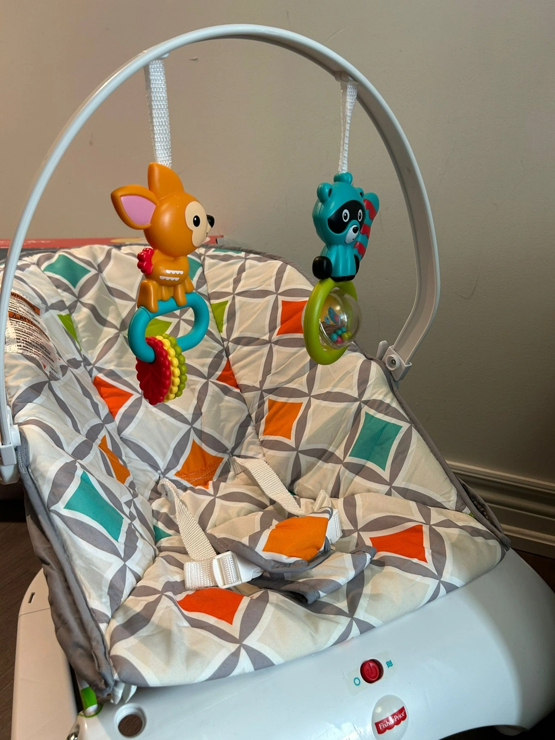 16Portable infant seat that gently bounces along to your baby's natural movements Features: - Removable toy bar with raccoon spinner and deer clacker rings - Calming vibrations help soothe your baby (1D battery excluded) - Machine-washable, multicolor seat pad - Secure snuggle spot with a modern, non-skid design and adjustable, three-point harness Dimensions: 21" x 16.5" x 14.5" in Weight: 3.72 kg (Compare at RETAIL PRICE on Amazon $79.65 + HST) **Can meet / drop off at mutual location**