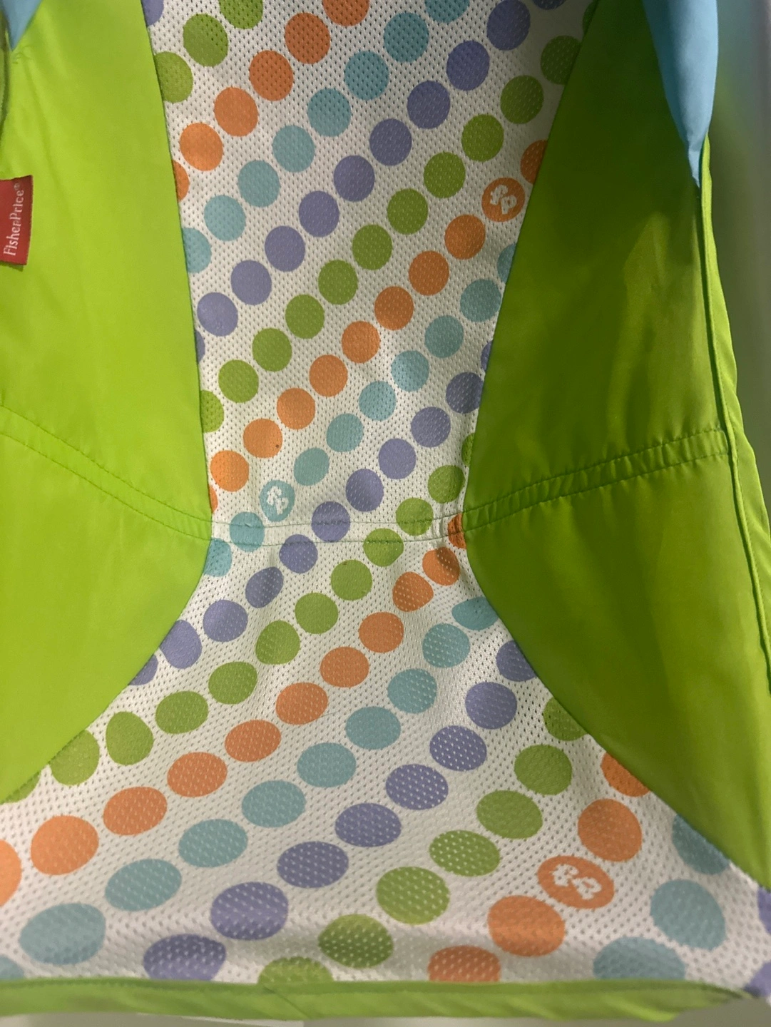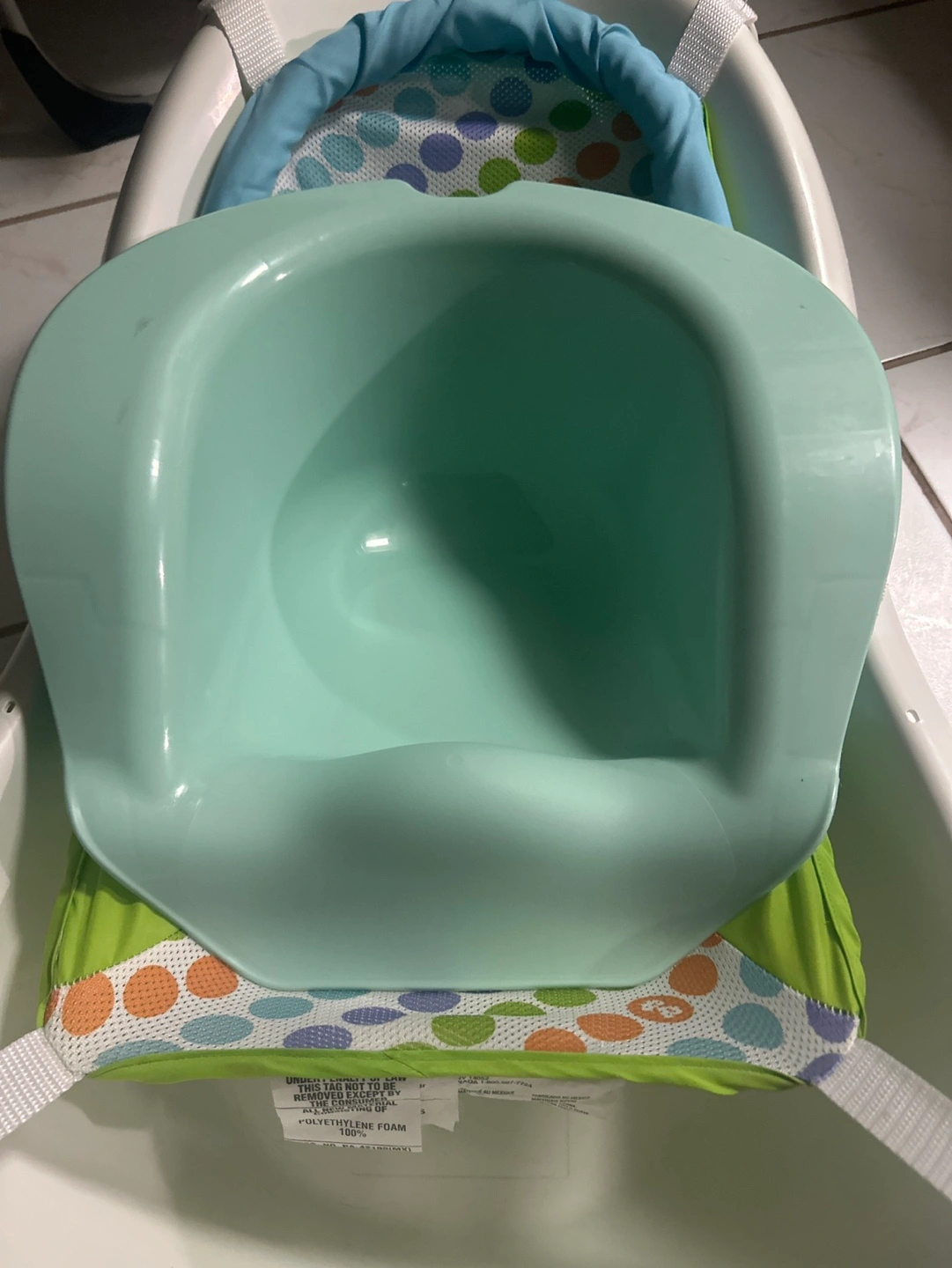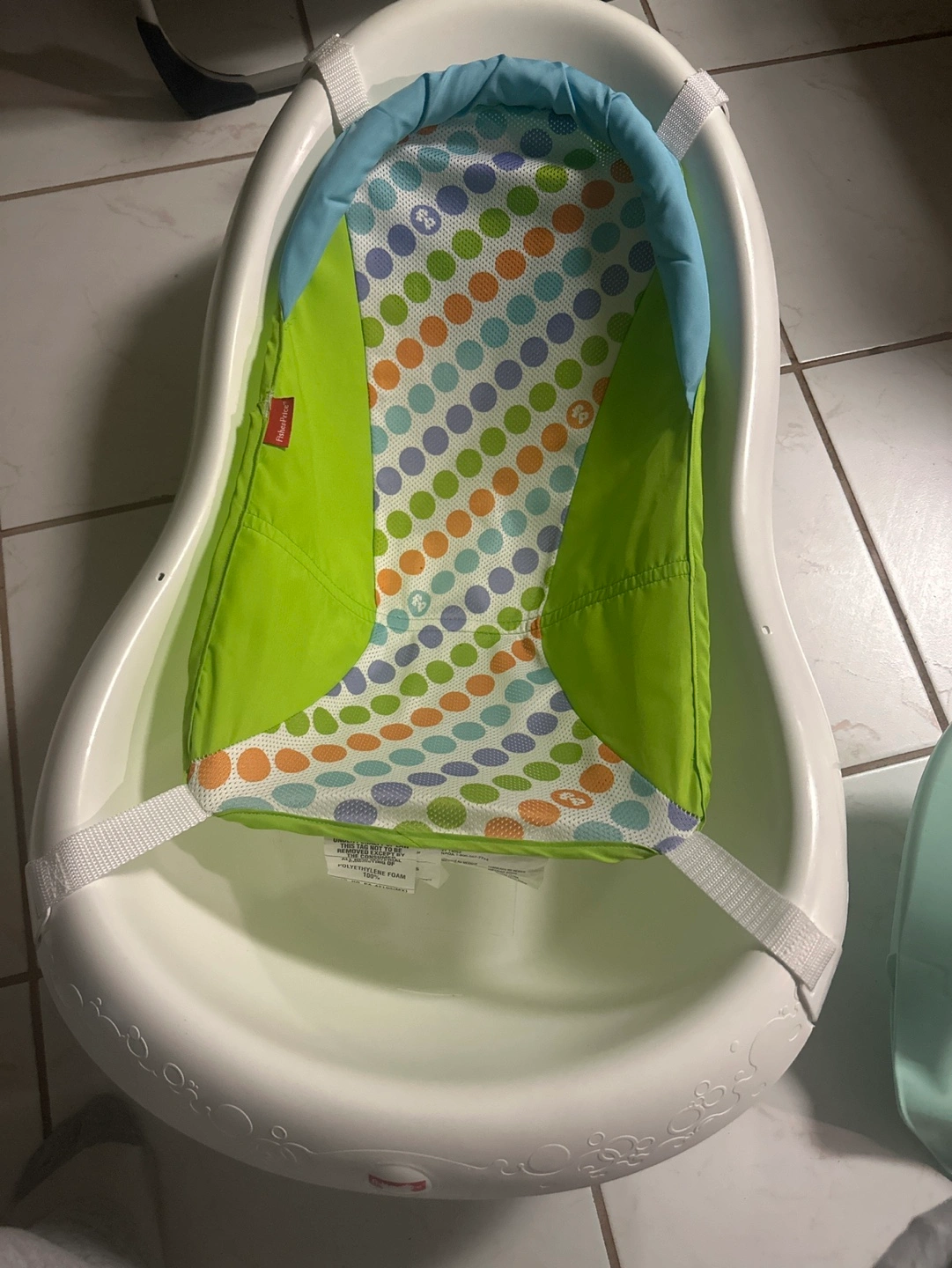 Baby bath tub, white plastic, green and blue padded insert. Newborn support included. Gently used.